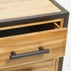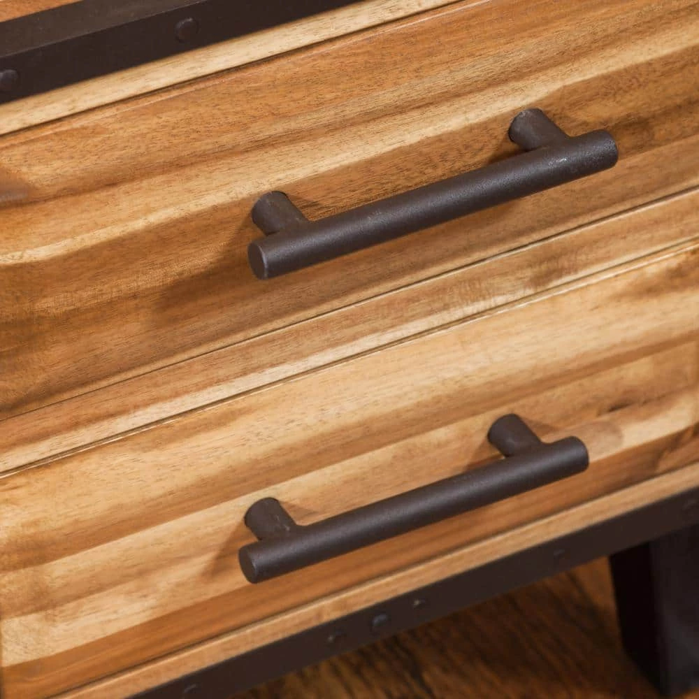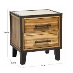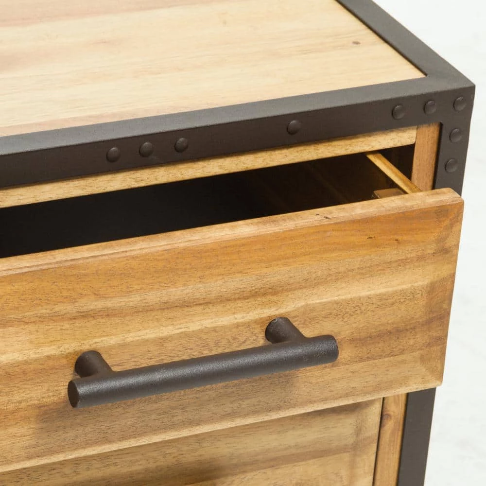This nightstand made of acacia wood is the perfect accent piece for any room in your home. Made from acacia wood, this cube-shaped nightstand with 2-drawers sports durability. The natural brown wood with stains and the black metal frame brings a rustic charm to the piece. With neutral colors and an industrial touch, this nightstand with four legs will compliment any bedroom decor it is placed next to.