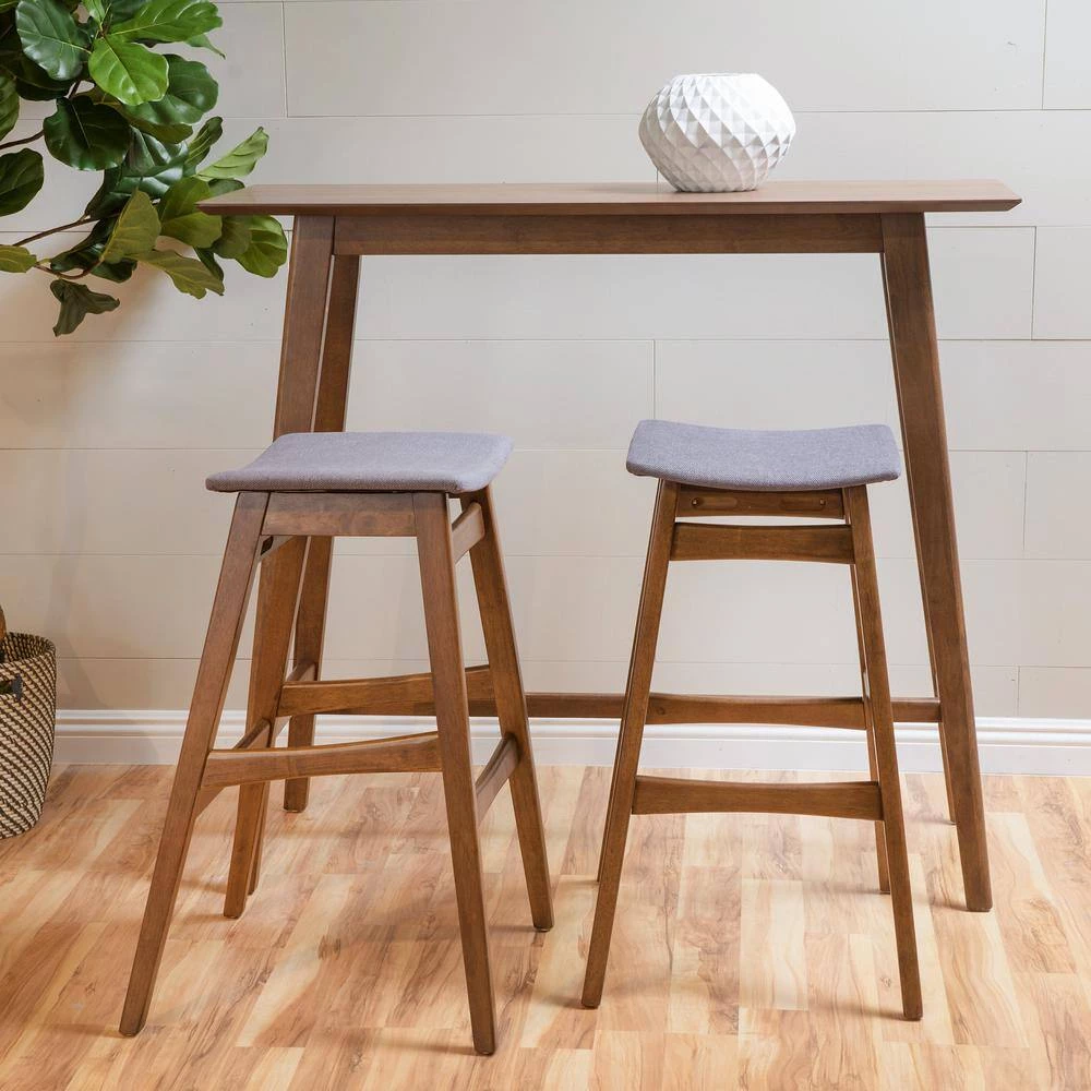 Short on dining space but have a big heart to entertain? Our three-piece dining bar set is the answer to your problems. Featuring beautiful wood frames and refined upholstery, this set brings a delightful mid-century modern charm to any space short on style. Both the barstools and table showcase iconic splayed legs, bringing the epitome of retro luxury to any home. Perfect to use as your dining table or as extra seating and serving space, you will be over the moon about this set.