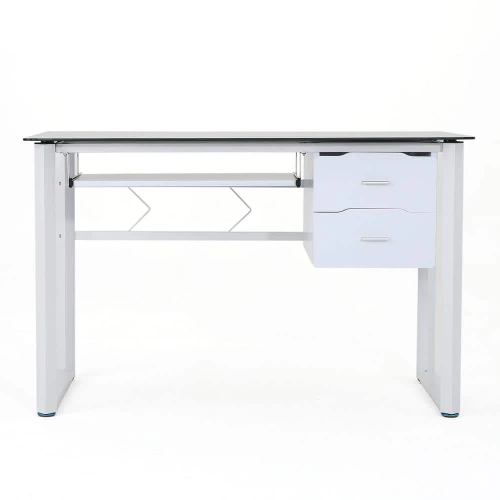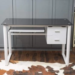 Stylish and highly functional, this computer desk has it all. The tempered glass top gives you a large, smooth surface that can accommodate all of your work materials. Includes a sliding keyboard tray, and two drawers.