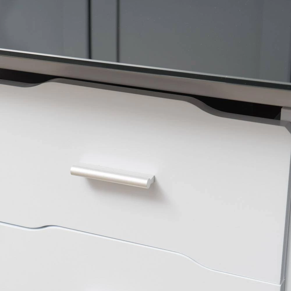 - Drawer Material: Faux Wood Overlay : Table Top Material: Tempered Glass : Frame Material: Iron