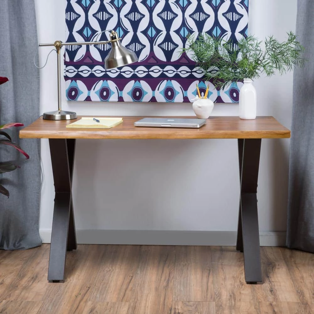 Add some style to your work with the Jedidiyah Teak Finish Acacia Desk. This stylish desk is sure to fit with any decor and bring some natural colors into your office. With its iron legs, this desk is a sturdy companion, ready to support you in all of the work that needs to be done. The Acacia wood is the perfect working wood, giving the Jedidiyah Desk the ideal robust finish.