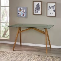 Enhance your work space with a desk that offers your office a sophisticated atmosphere of stunning design. With a tempered glass tabletop and rich acacia wood base, this modern desk will instantly add refinement and class to your work station. This table is finished with gorgeous A-shaped frames that bring both a mid-century modern vibe as well as incredible durability. This bold accent piece will spur your creativity during work and uplift your mind with inspiration for years to come.