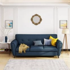 This traditional buttoned 3-seater sofa is a wonderful addition to any living room. Featuring 3 extra padded seat cushions, this sofa offers maximum comfort. The graceful, understated design and navy blue coloring allow this sofa to blend perfectly with any furniture you currently have.