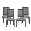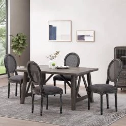 Offer your dining space the perfect perch with seating that will set the tone of your decor. Drawing from French country inspiration, our set of upholstered dining chairs features an iconic round backrest made with cane, smooth upholstered seating, and fluted legs, offering your home something a little out of the ordinary while also remaining true to their elegant, old-fashioned roots. Their weathered frames showcase wonderfully contrasting lines and curves that encourage both casual meals with your family or extravagant dinner parties with your guests.