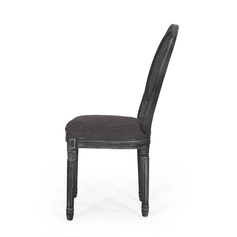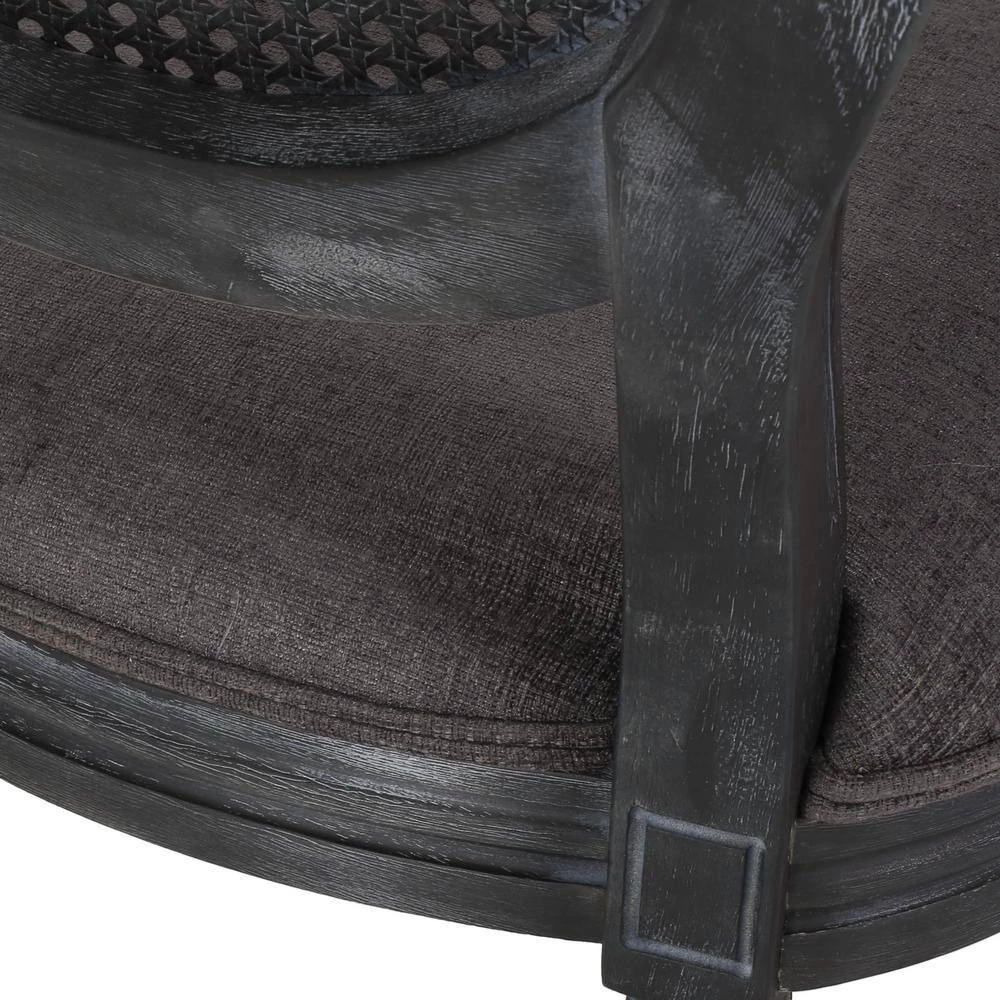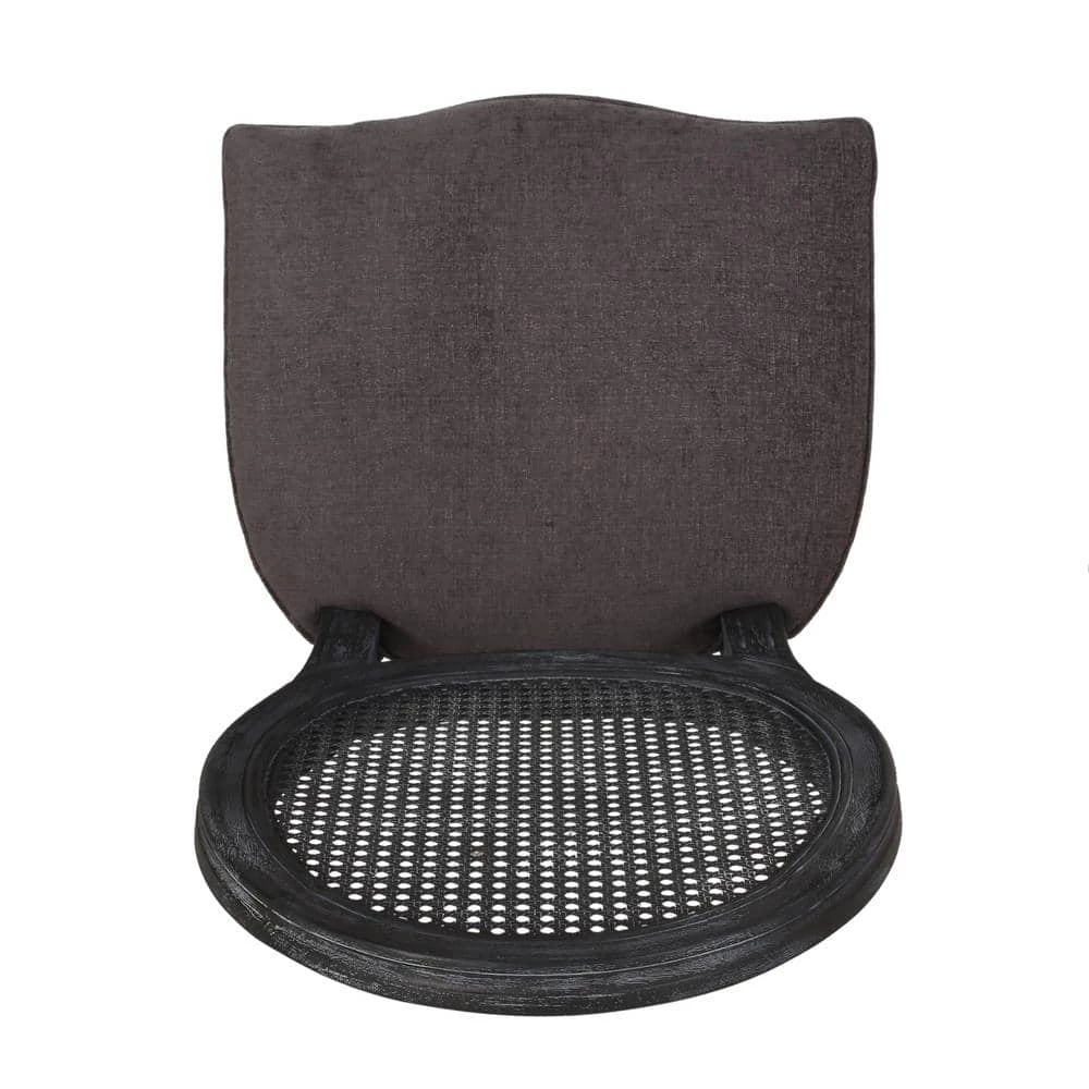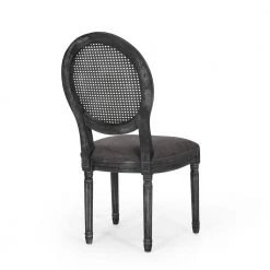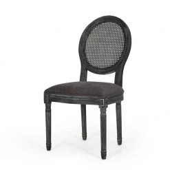 Offer your dining space the perfect perch with seating that will set the tone of your decor. Drawing from French country inspiration, our set of upholstered dining chairs features an iconic round backrest made with cane, smooth upholstered seating, and fluted legs, offering your home something a little out of the ordinary while also remaining true to their elegant, old-fashioned roots. Their weathered frames showcase wonderfully contrasting lines and curves that encourage both casual meals with your family or extravagant dinner parties with your guests.
