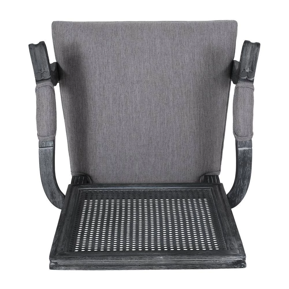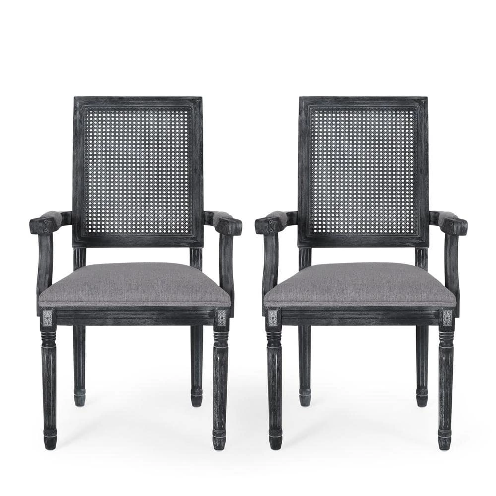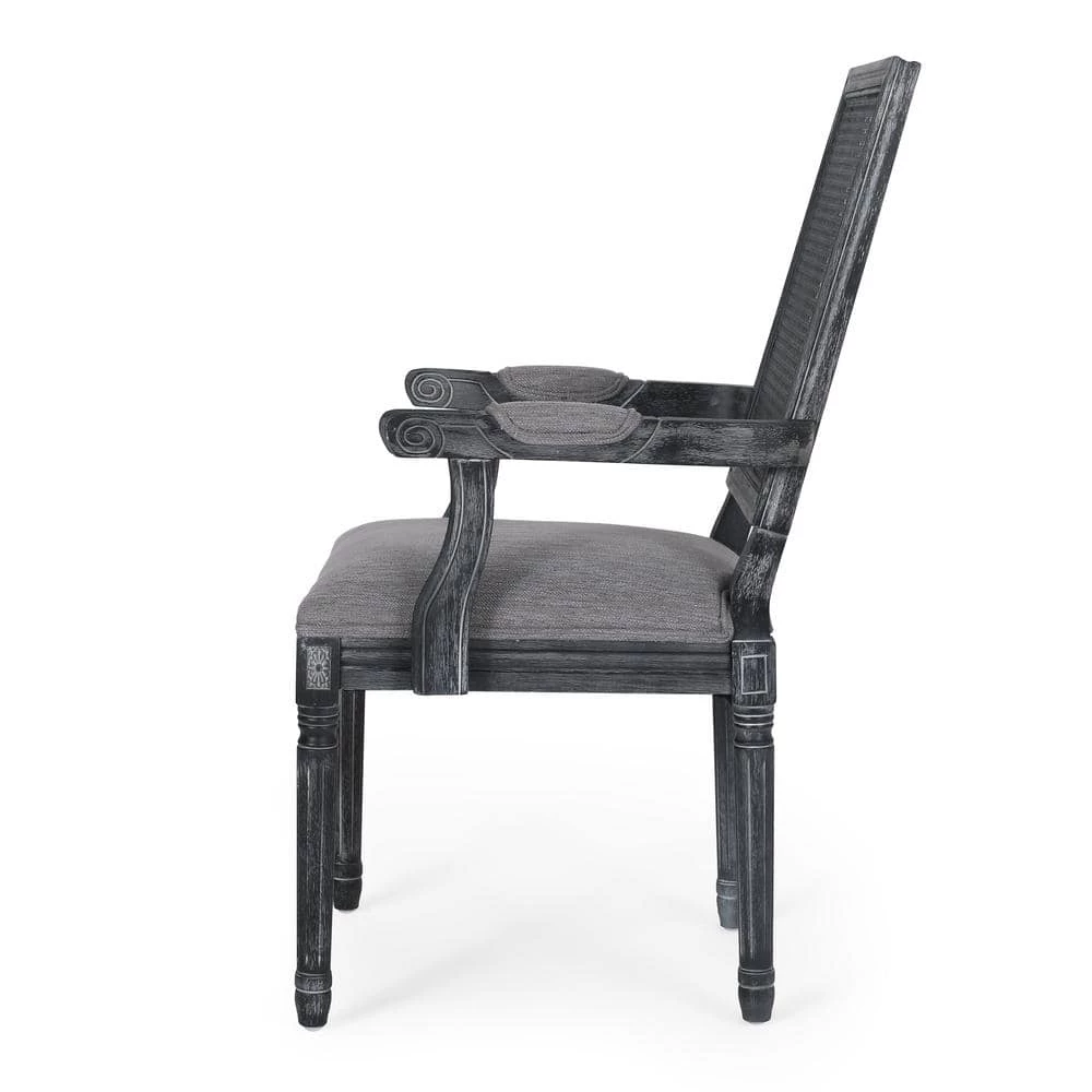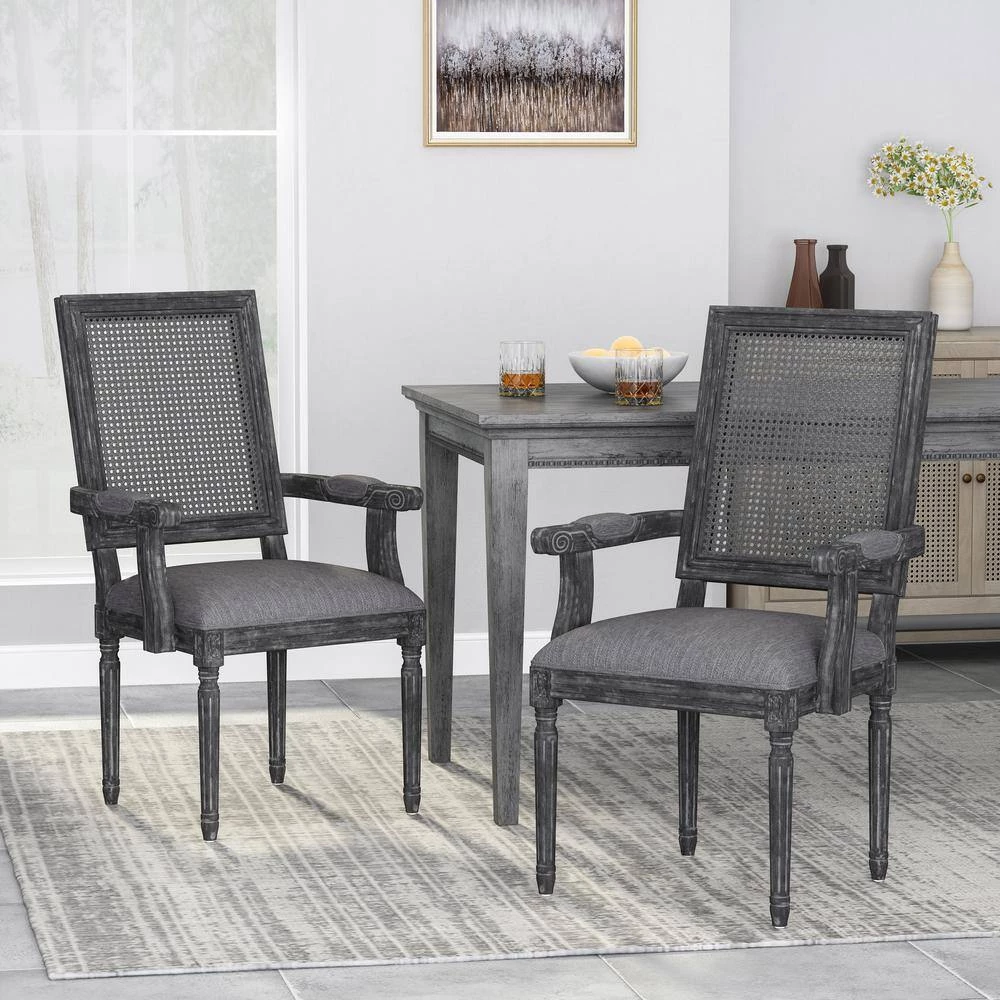 Transform your dining area into one of classic sophistication with seating of utmost style. Drawing from French country inspiration and Queen Anne styling, our set of upholstered dining chairs feature a square backrest made with cane, fluted legs, and exquisite armrests to offer your home something a little out of the ordinary while also remaining true to their elegant, old-fashioned roots. Their weathered frames showcase wonderfully contrasting lines and curves that encourage both casual meals with your family or extravagant dinner parties with your guests.