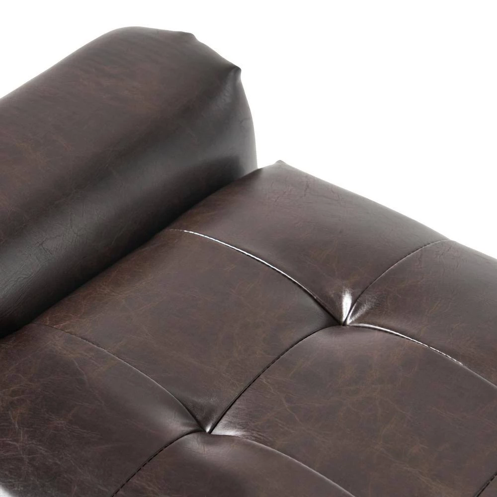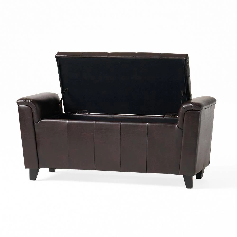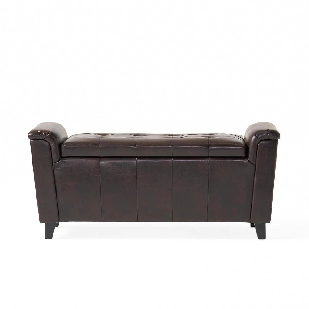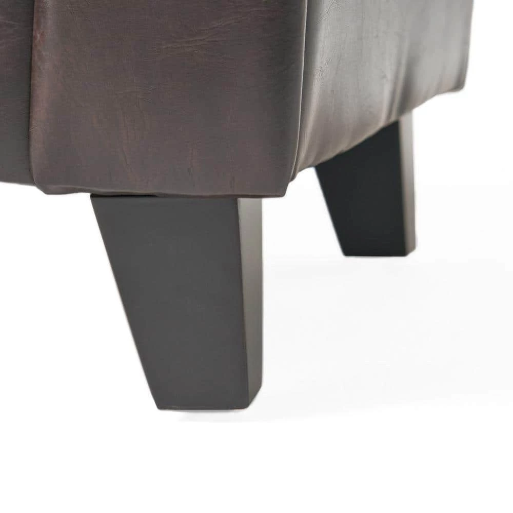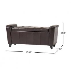 Use the durable alden ottoman bench as a wide extra seating option as the plush design and padded arms make it a comfortable place to relax. Constructed with a solid wood frame for durability, this ottoman has a PU leather upholstery that creates an elegant style. Its dark brown finish will easily match any existing decor.