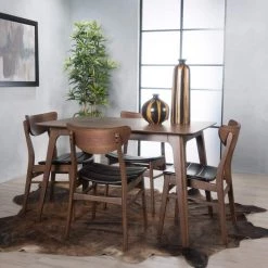 With matching wood finishes, you just can’t go wrong with this dining set. Including one table and four chairs, this set is ideal for any home. The mid-century style and smooth wood finishes of this set will compliment any decor, so you don’t have to worry about clashing color pallets in your home. The dining chairs feature a sturdy design with soft fabric cushioned seats, providing both comfort and style for your dining pleasure.