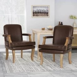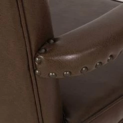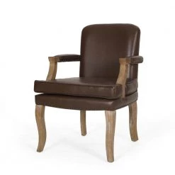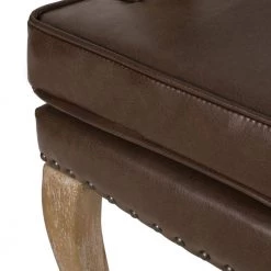 Upholstered with dark brown faux leather with natural wood frame.