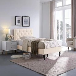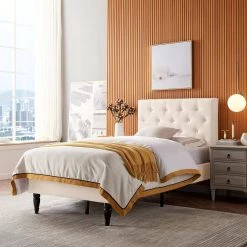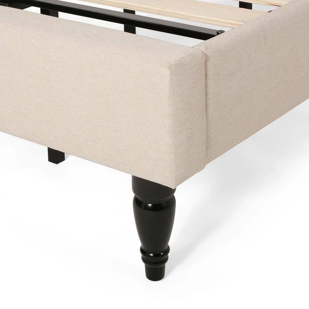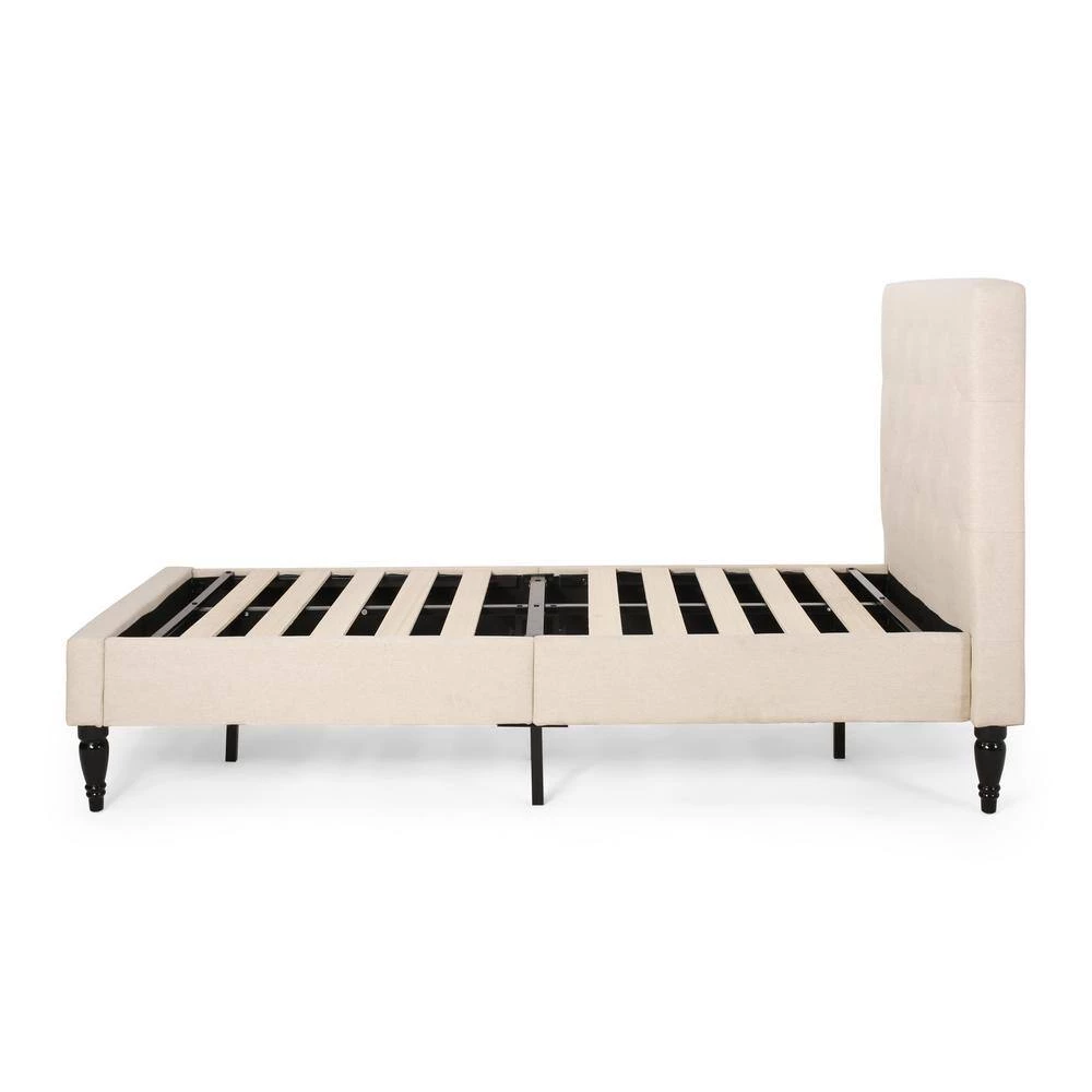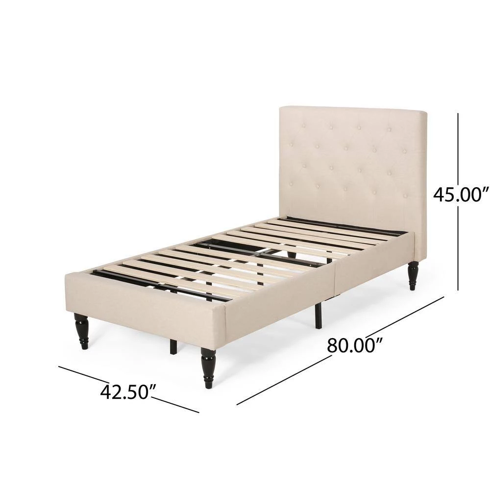 Every night can be spent in refined luxury and sweet dreams. Change the pace of your bedroom with a refreshing centerpiece of stunning design and outstanding stability. This stylish bed frame offers a timeless elegance for your home while providing a low profile and sturdy slat design to eliminate the use of a box spring. Featuring classic button-tufted diamond stitching, lovely turned legs, and plush upholstery, this sophisticated bed frame is built to imbue the room with a feeling of contemporary style.