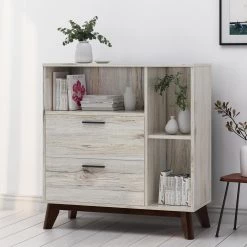 Looking for an accessory to clear up the clutter in your home. Get the job done with an accessory of stylish character and incredible function. Featuring a stunning mid-century modern design, our 2-drawer cabinet brings a sophisticated touch to your home. This cabinet offers a smooth wood finish, delightfully splayed legs, and plenty of storage space, giving you ample room and style to organize your items. Blending seamlessly with your existing decor, this cabinet will bring out the best of your interior space.