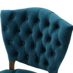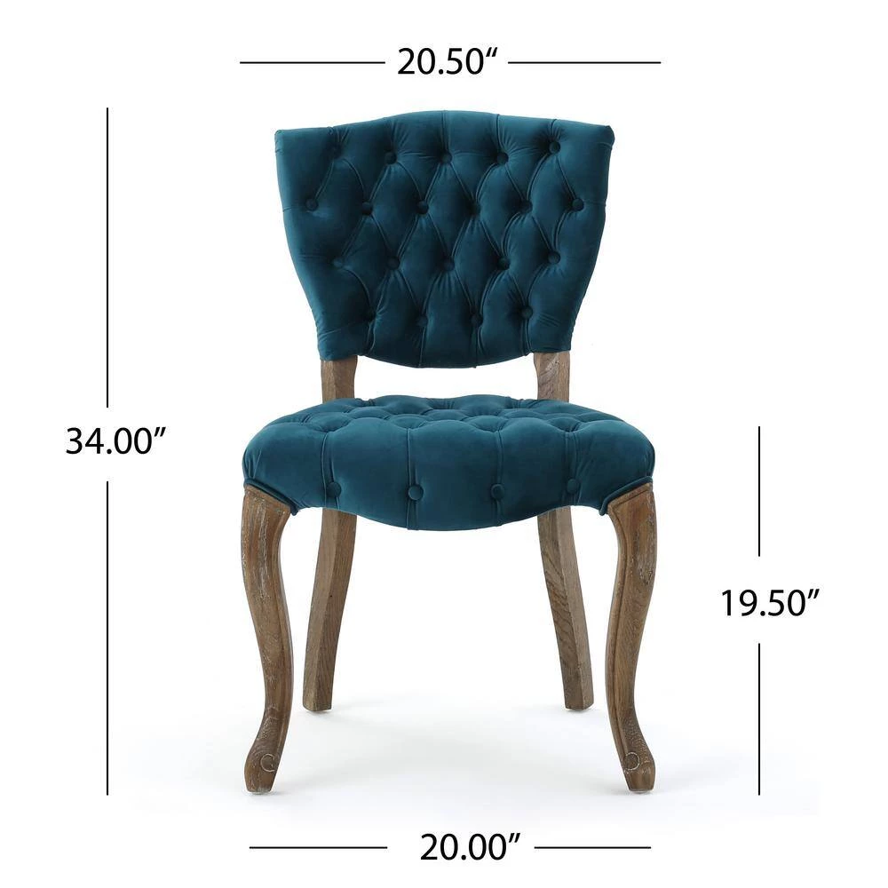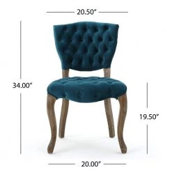 For a European inspired design, look no further than these tufted dining chairs. This set of two chairs offers ample tufting, a solid frame, and intricately carved wooden legs. These chairs feature a dark teal finish with natural-colored legs.