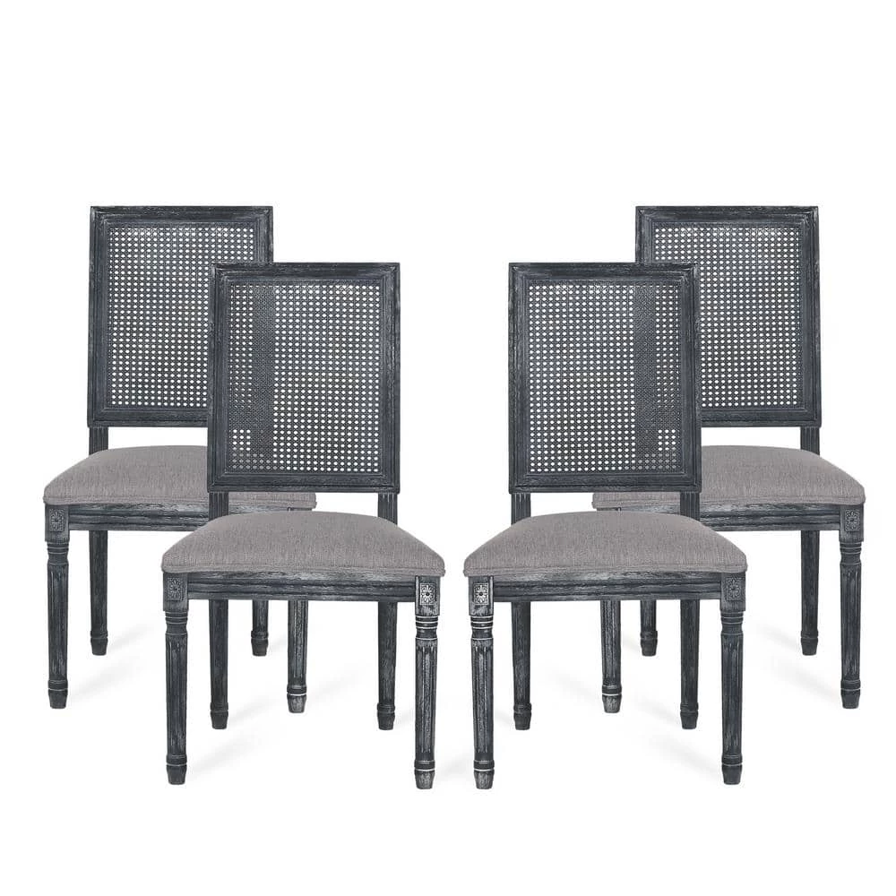 Finely crafted with sophistication, these chairs turn your dining area into a masterpiece. Drawing from French country inspiration, our set of 4 dining chairs feature an understated rectangular backrest made with cane, smooth upholstered seating, and fluted legs to offer your home something a little out of the ordinary while also remaining true to their elegant, old-fashioned roots. Their weathered frames showcase wonderfully contrasting lines and carved accents that encourage both casual meals with your family or extravagant dinner parties with your guests.