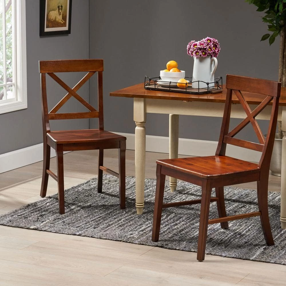 Stop and take in a refreshing breath of breezy cottage charm that makes your kitchen space a place of warm, nostalgic memories. Our set of farmhouse dining chairs is constructed of deep, rich acacia wood with a classic X-back frame to create the ultimate country-side look for your home. Finished with gentle curves that are offset by sturdy, straight lines, our delightful chairs provides exceptional support and design that will instantly transform your dining space into a homey masterpiece.