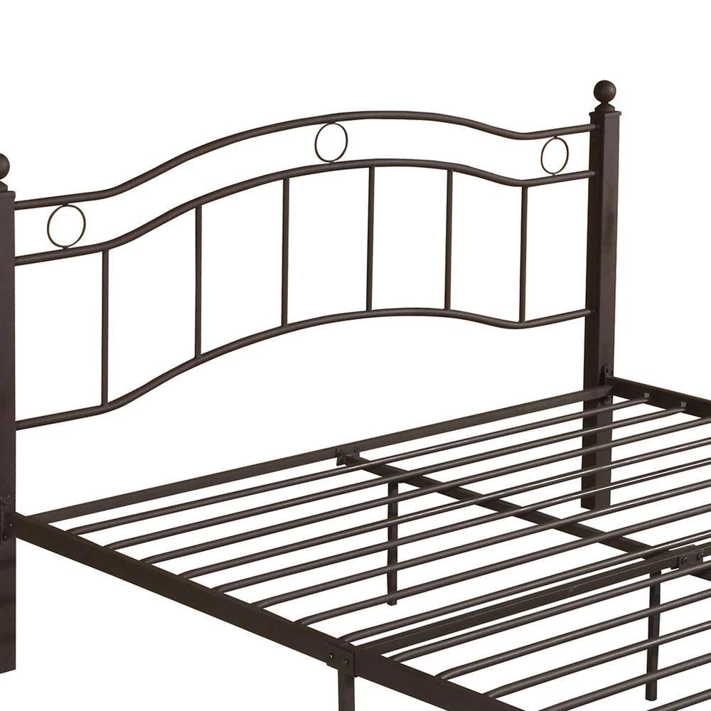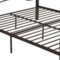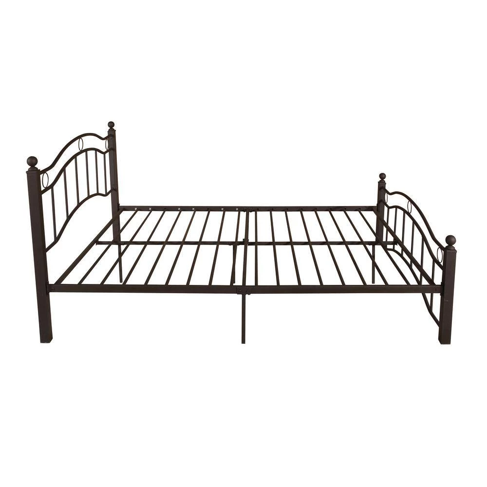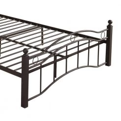 Combining classic convention with modern appeal, our metal bed frame strikes a delicate balance between old and new. This stylish frame offers a timeless elegance for your home while providing a low profile and sturdy slat design to eliminate the use of a box spring. Featuring classic finials at each post and an intriguing geometrical motif ornamenting both the headboard and footboard, this sophisticated bed frame is built with iron to imbue the room with a feeling of contemporary style.