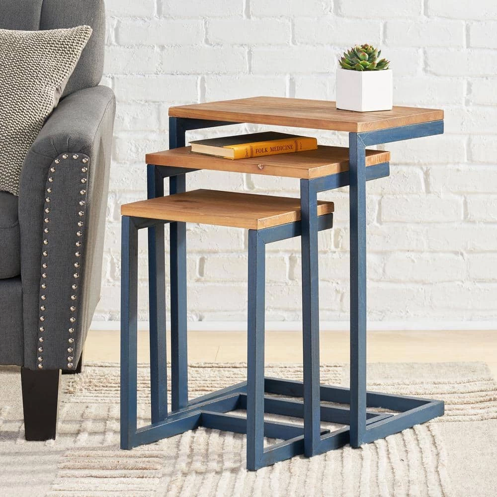 Let these set of 3 fir-wood nesting tables provide the stylish display options you need. They feature rectangular wooden tabletops with a rustic natural brown wood finish. The rectangular black metal table frame features an open back design that allows nesting so you can maximize your space. This table set is also the perfect complement to your seating area since they can be used as end tables and pedestals for displaying your decor.
