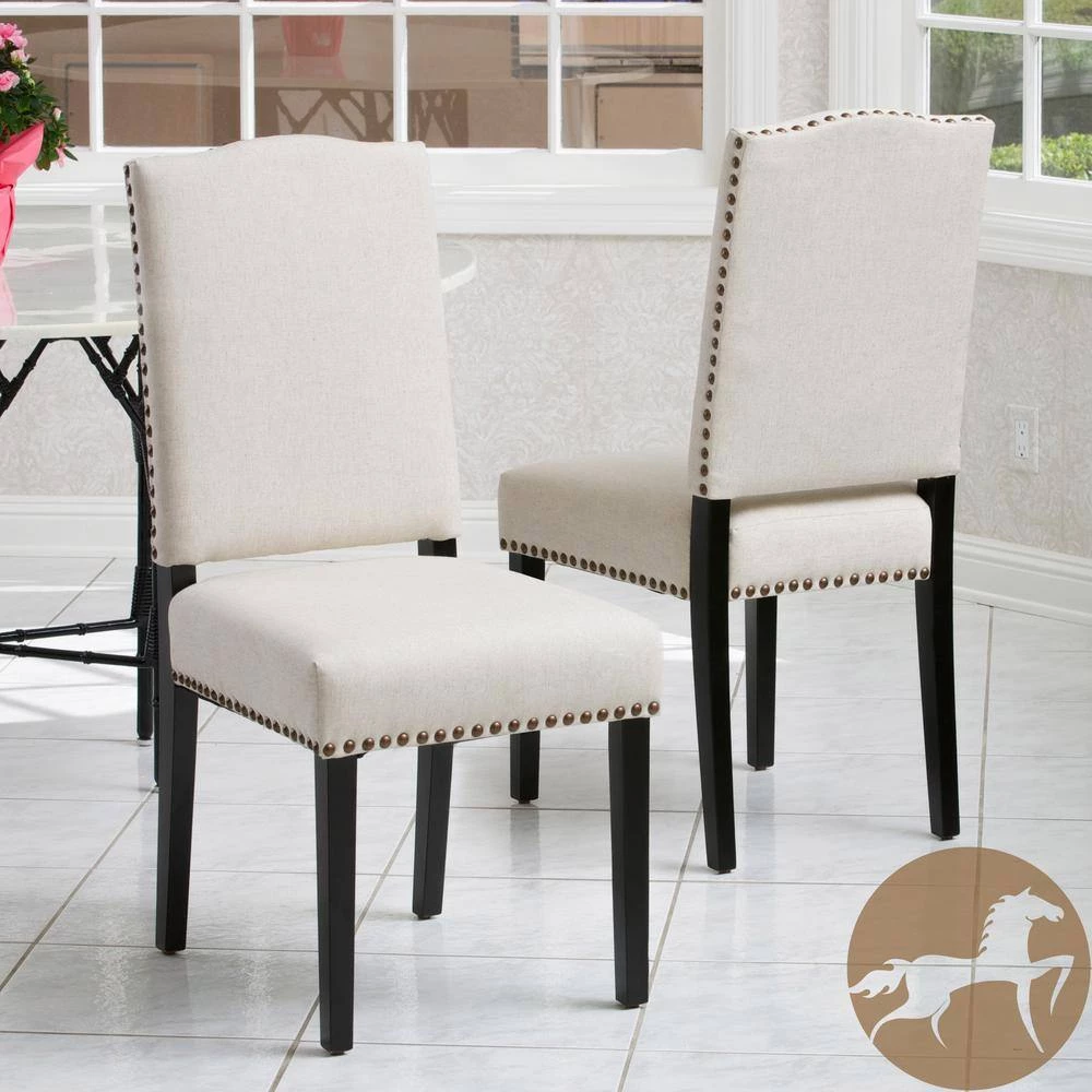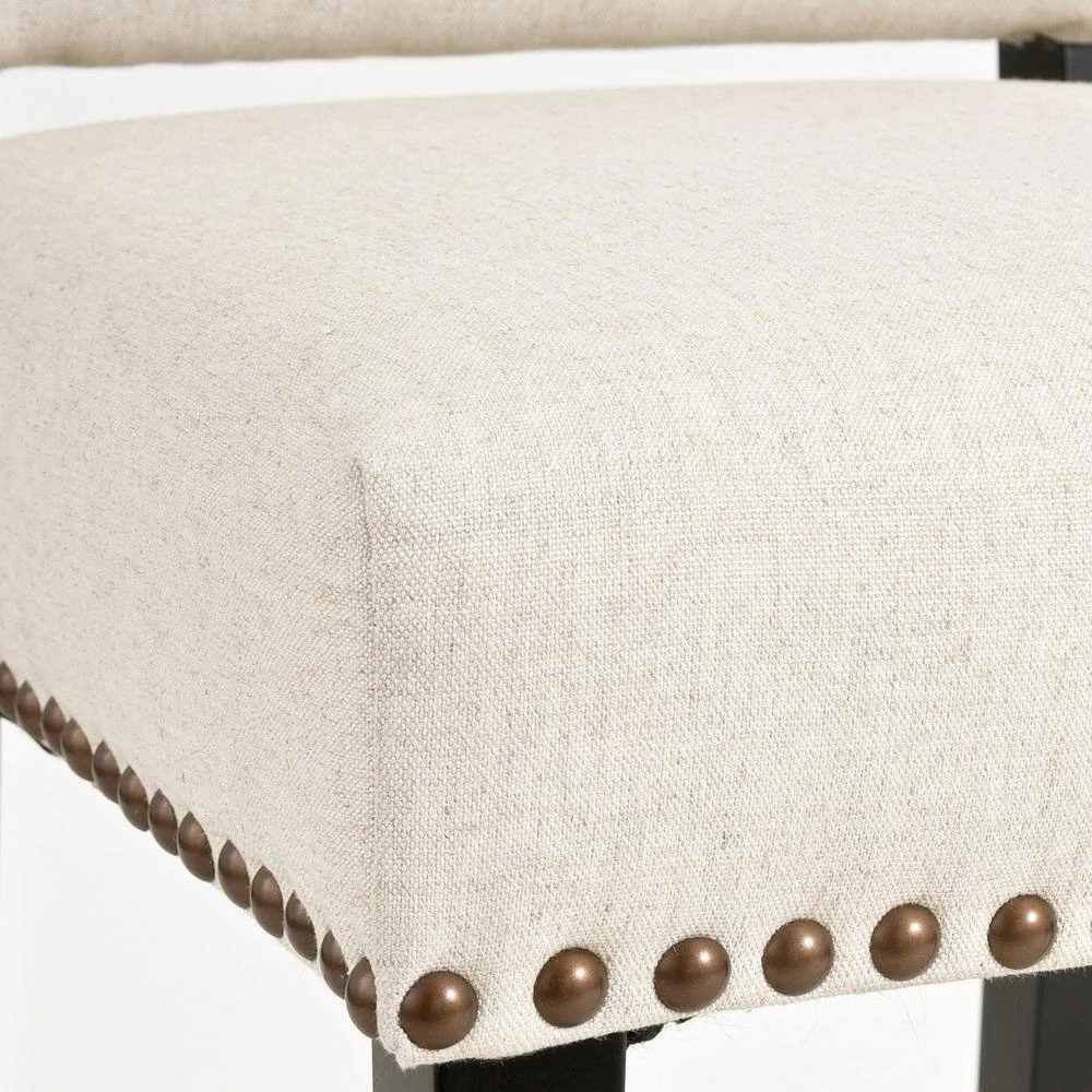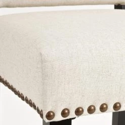 The Brunello offers users comfortable seating and elegant style. This chair is upholstered in beige polyester fabric with bronze colored studs along the perimeter and espresso colored legs. Youll be sure to impress guests with this dining chair.