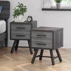 Your phone, alarm clock, and bedside lamp can be an arm’s reach away while you snuggle into your blankets for a night of good rest. Featuring a smooth wood-like finish that is supported by sturdy iron legs, our nightstands bring modern industrial sophistication to any bedroom with its sleek look. This nightstand set is completed with plenty of storage space, giving you ample room and style to organize your items. Blending seamlessly with your existing decor, these nightstands will frame your bed with a raw and edgy charm.