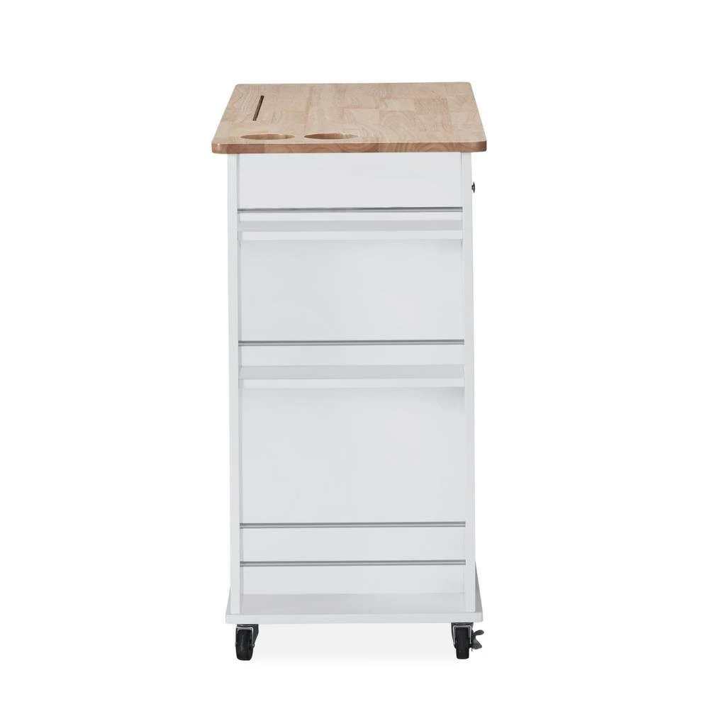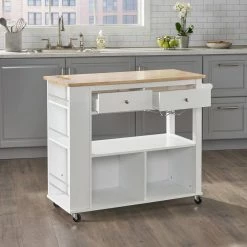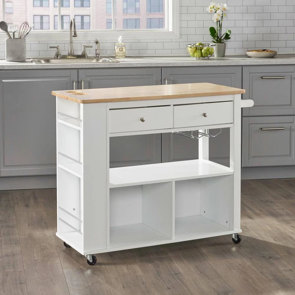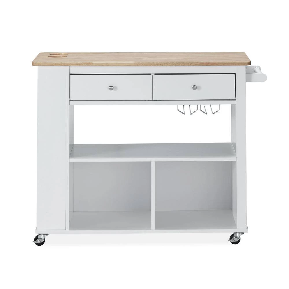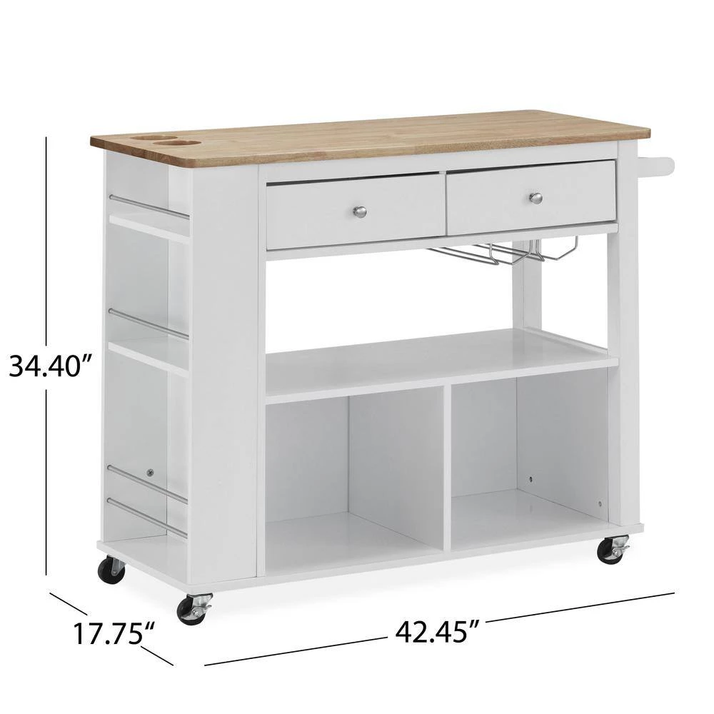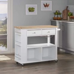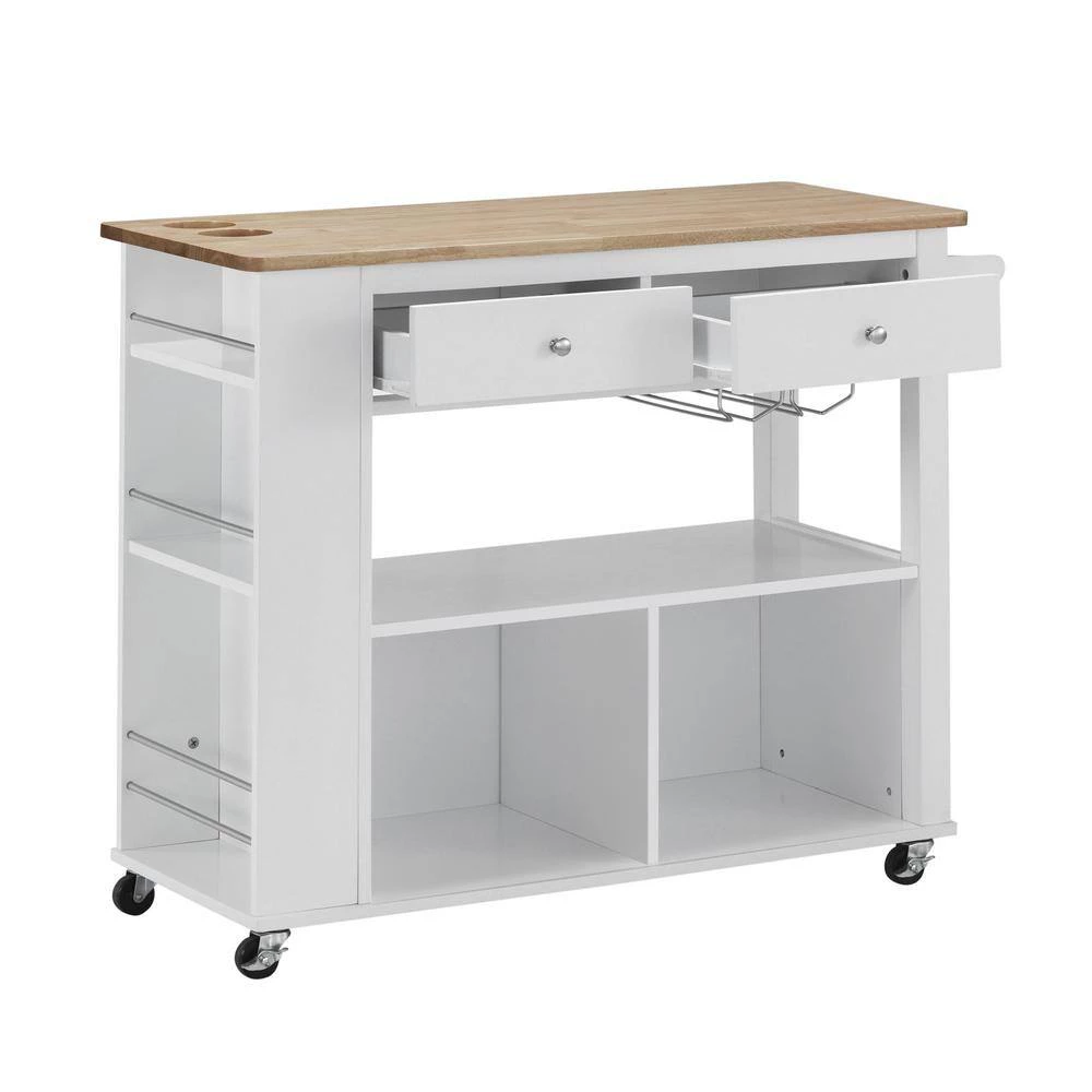 Enliven your interior space with a kitchen island cart that showcases handsome looks and convenient functions. From handy wine glass racks to an easy-access towel holder, our kitchen cart offers ample organizational space to upgrade your living standard with a breeze. This piece features two drawers, shelving and two enclosed cubbies to give you plenty of options to effortlessly and efficiently store your kitchen accessories. Crafted with sturdy wood and rolling casters, our kitchen cart brings a fresh yet timeless look for all to enjoy.