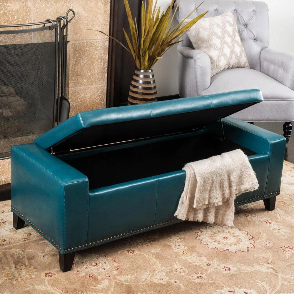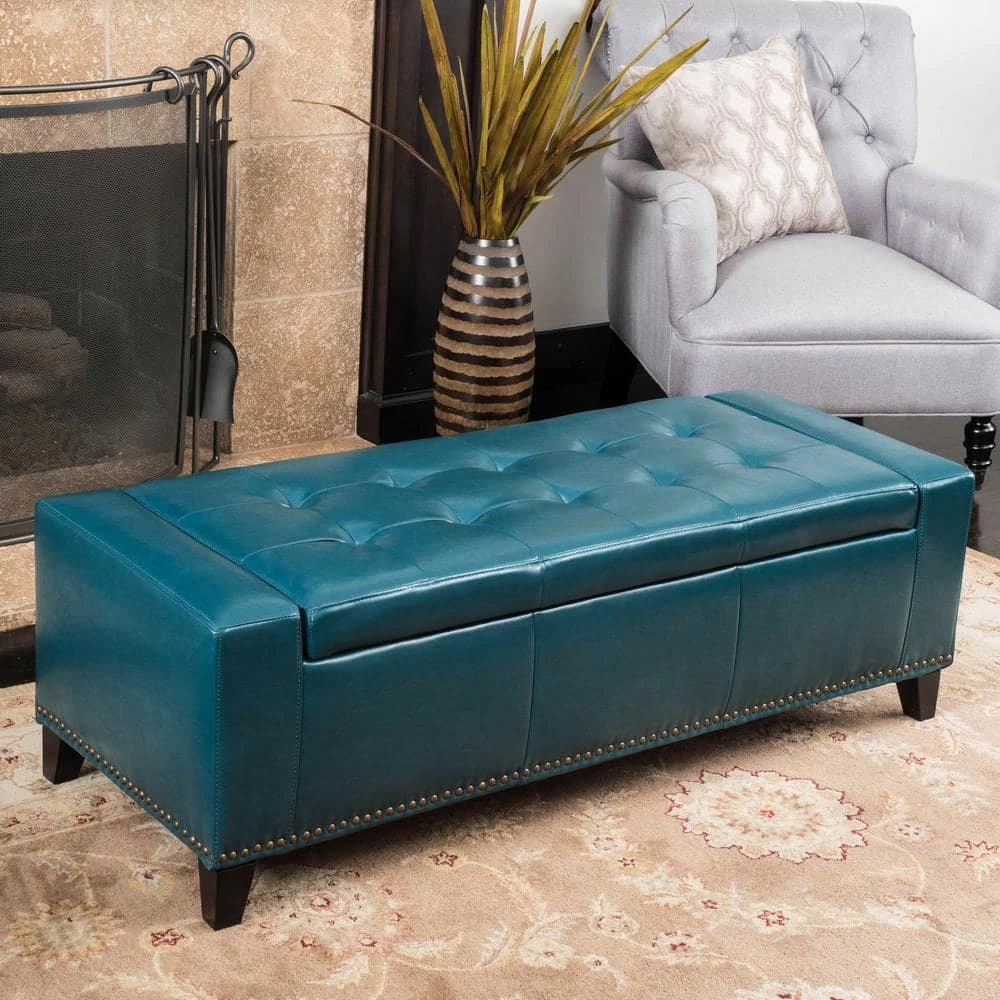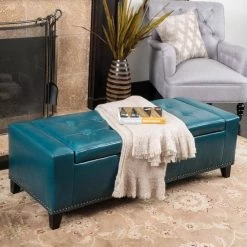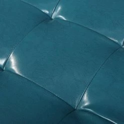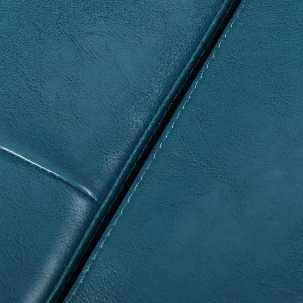 - Teal leather upholstery adds a pop of color to rooms and spaces