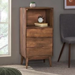 Style your bedroom with an organizer that stores all your essentials with ease. Created for both functionality and impeccable style, our mango wood chest of drawers effortlessly brings a chic mid-century modern atmosphere to any space with a simple yet sophisticated structure supported by sleek splayed legs. Completed with three drawers and a display cubby for ample storage space, our impressive accessory provides all sorts of options to remove clutter that will have all your guests in awe of your decor.
