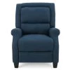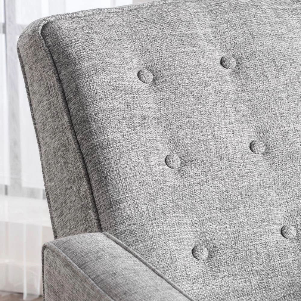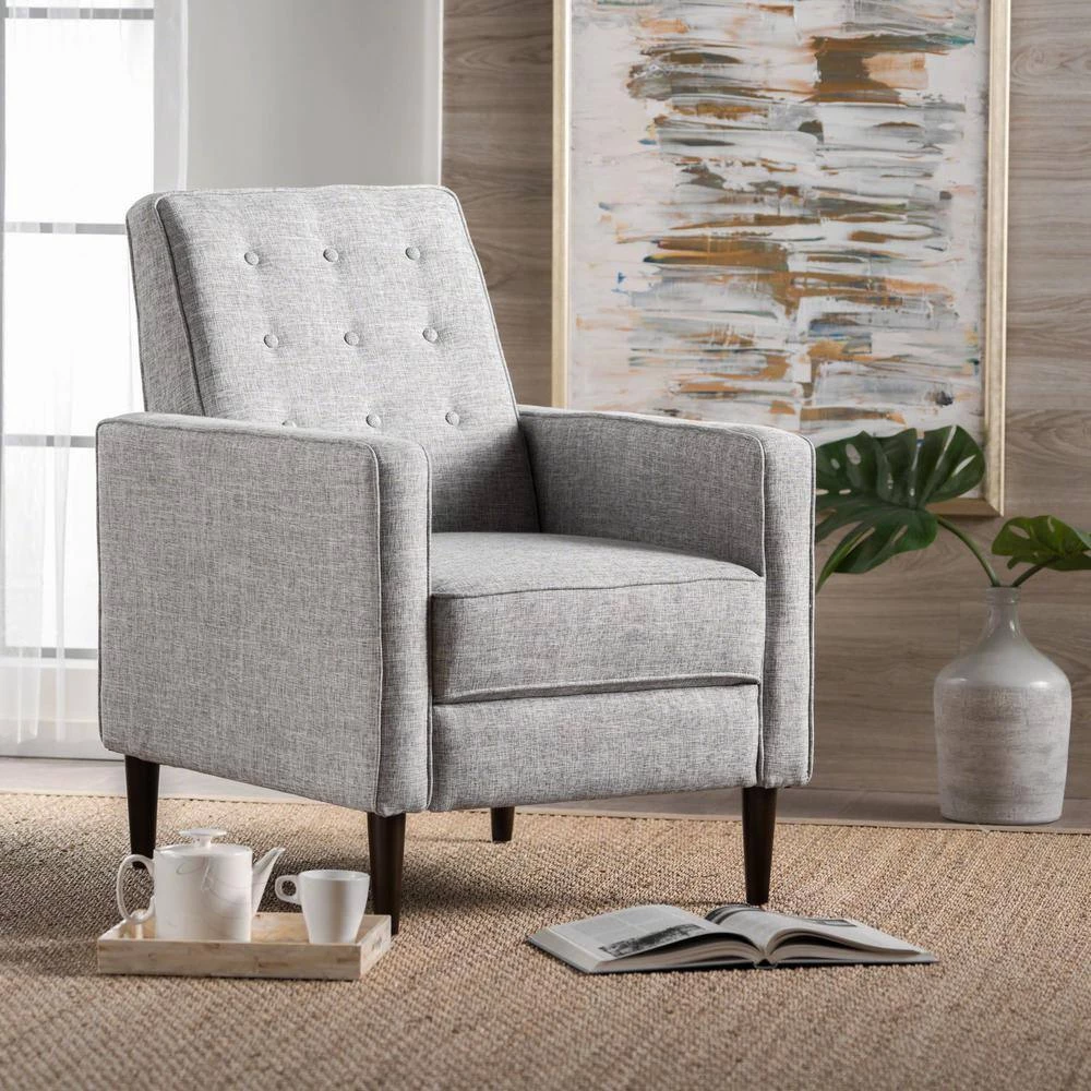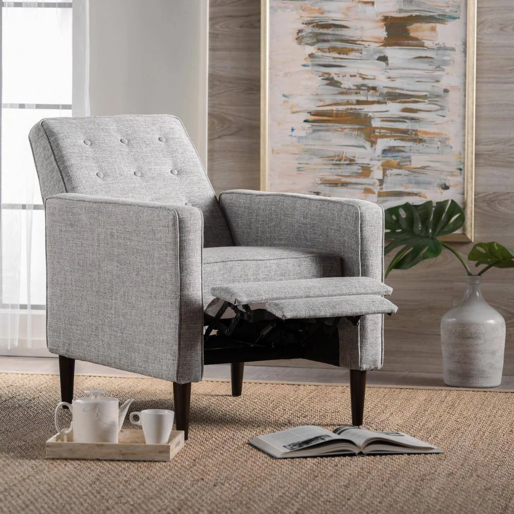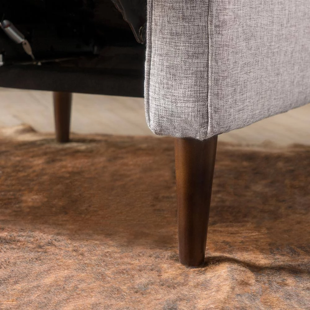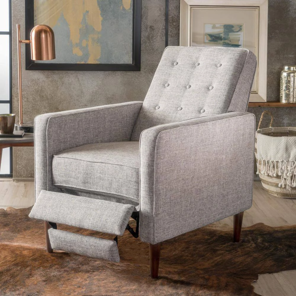 This mid-century, modern recliner is a wonderful addition to any room in your home. Featuring clean lines and a smooth finish, no one will even know that this chair is a recliner until you are putting your feet up after a long day. Complete with a slightly tufted back and an extra padded cushion for maximum comfort, this recliner does it all. Everyone will be asking for a turn to relax in this recliner chair of yours.