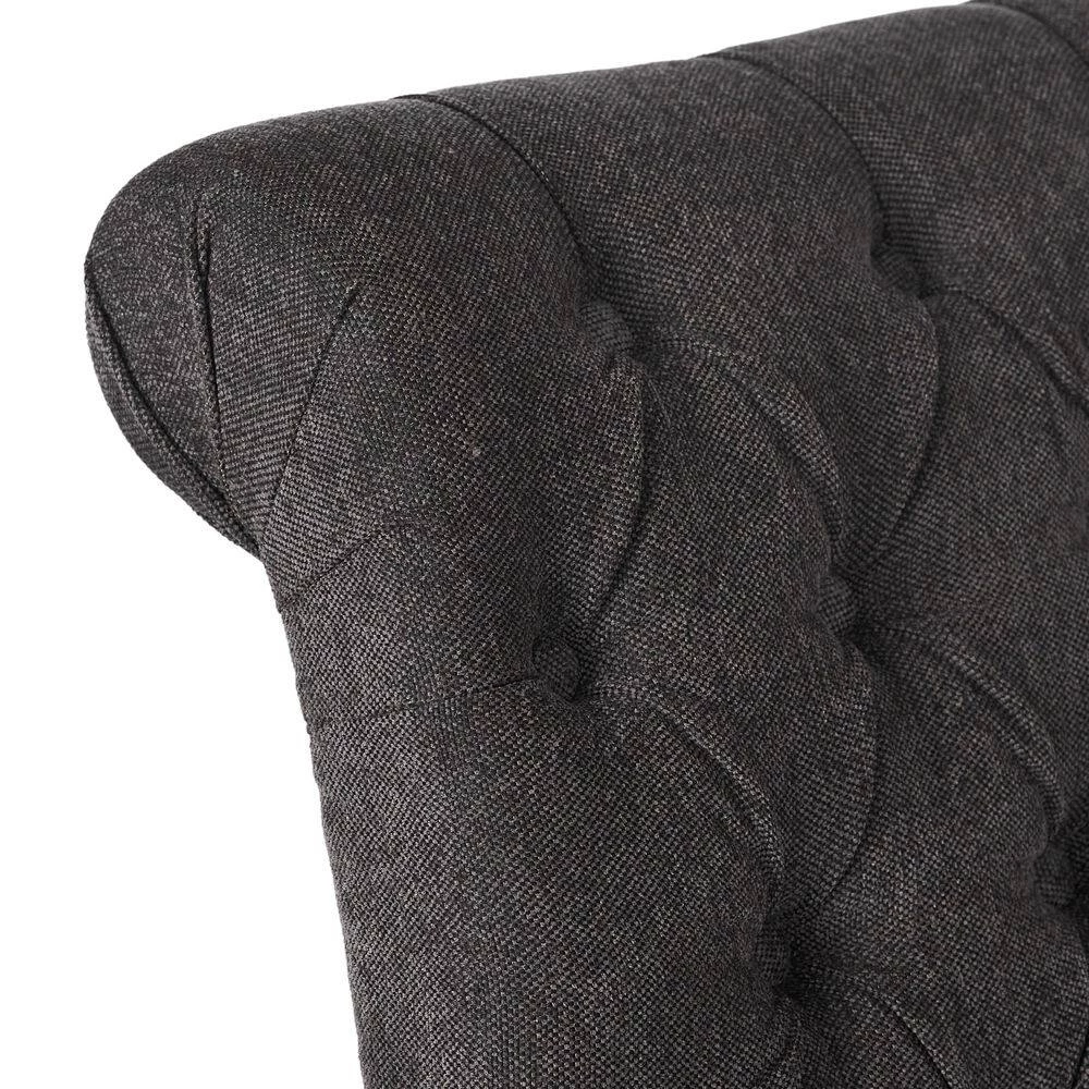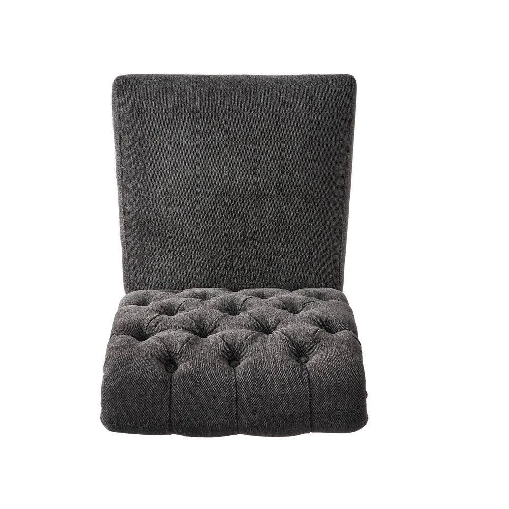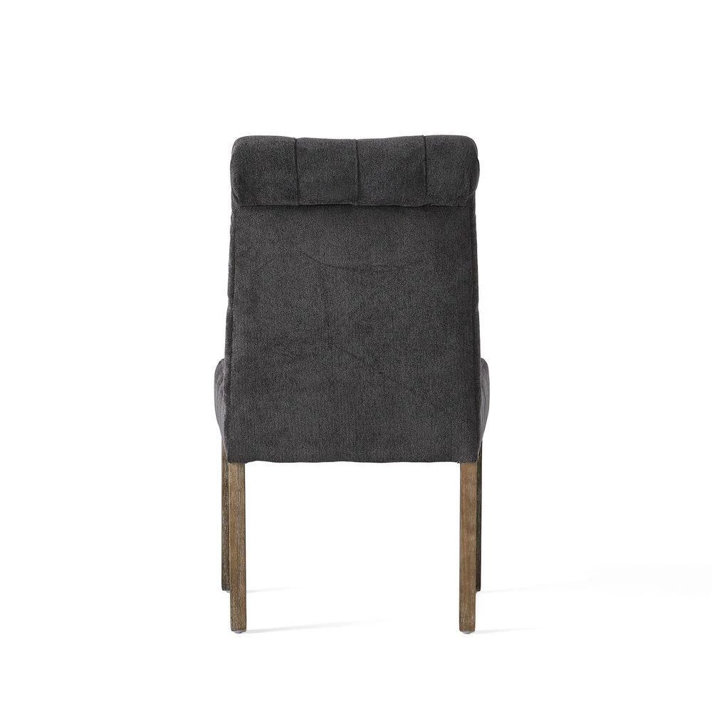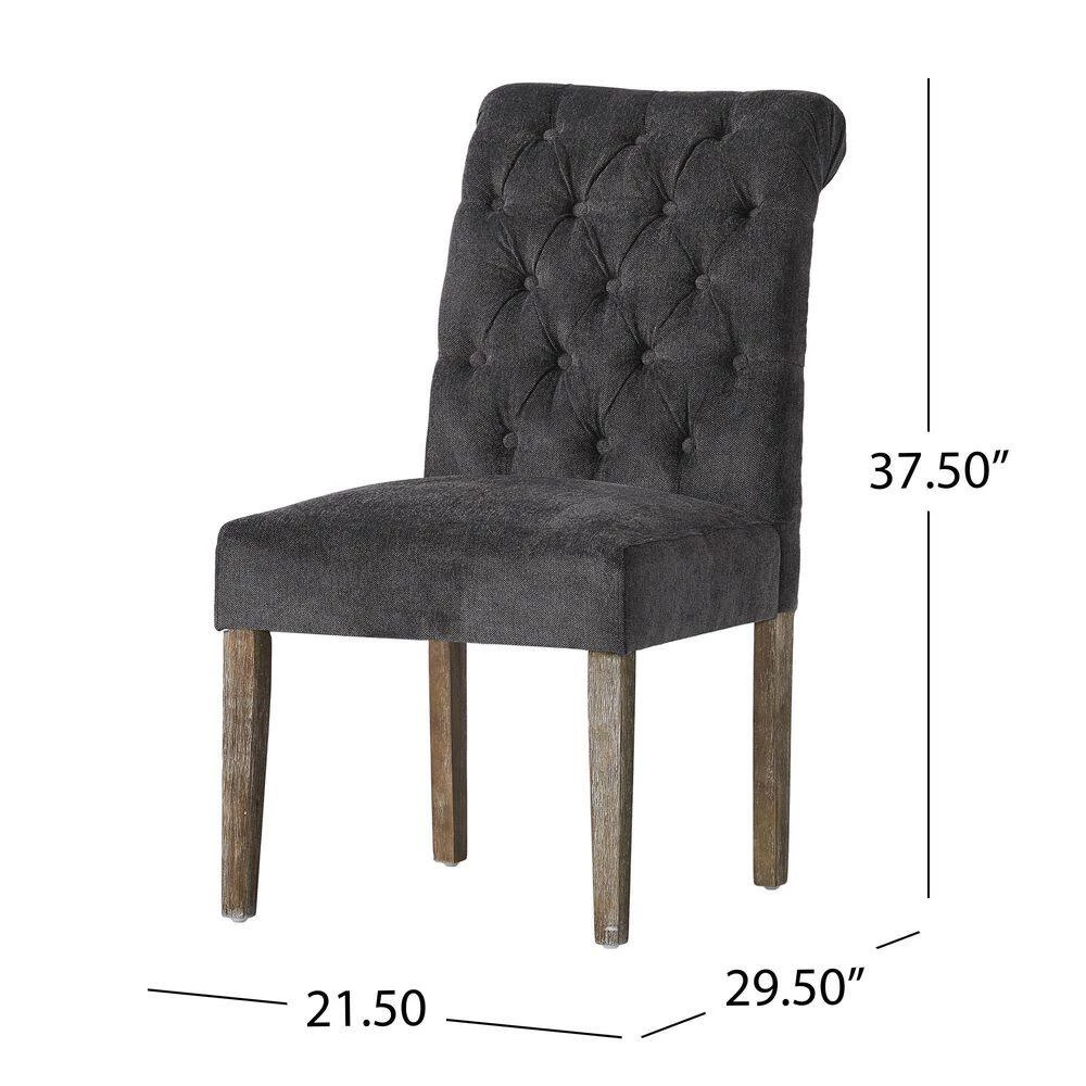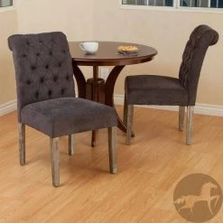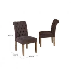 With an elegantly rolled top and tufted features, the Dinah dining chairs are suitable for most any decor. These chairs feature a linen bland upholstery with complementary finish legs and compliment any room they are placed in with innovative design and attention to detail. Comfortable and solidly built, they are useful in the dining room or any other room as additional seating.