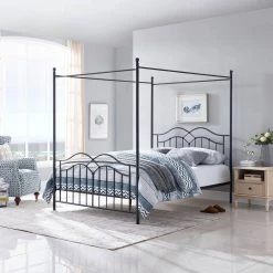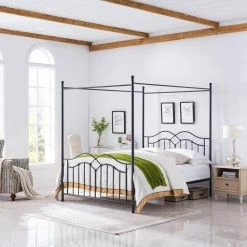 Sink into sweet dreams alongside soft arches and gentle curves that our exquisite canopy bed generously provides. This queen-size canopy bed frame offers a dazzling focal point for your room, featuring a minimalistic structure in neutral colors and a sturdy metal structure. With multiple support slats that cut out the need for a box spring, this set offers timeless elegance for your home decor while providing you maximum support. With a four-post structure, transform your room with the option of soothing fabrics that will wrap any bedroom in grace and style.
