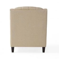 With its wide stance and overall soft padding, the Elaine Tufted Fabric Chair and Ottoman combines modern and classic elements to create one stunning chair. The chair features dark espresso stained legs, and tufted back. Its neutral colors will complement any decor.