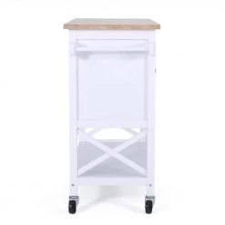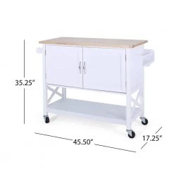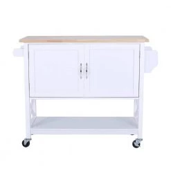 Bring outstanding design to the heart of your home with an accessory of impressive function. From a stunning farmhouse influence to easy-access towel holders, our kitchen cart offers ample organizational space to upgrade your living standard with a breeze. This piece features an open bottom shelf and a large double door cabinet space to give you plenty of options to effortlessly and efficiently store your kitchen accessories. Crafted with sturdy wood and rolling casters, our kitchen cart brings a fresh yet timeless look for all to enjoy.