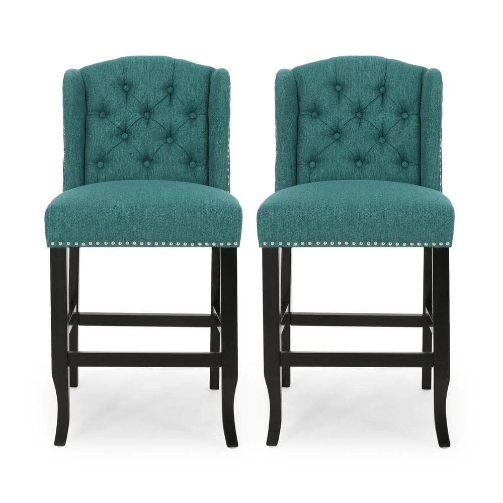 Offer your home the luxurious style it deserves with our set of gorgeous contemporary counter stools. Featuring a classic button-tufted backrest with diamond-patterned stitching and a refined wingback design, our counter stool set brings an elegant touch to any interior space. The upholstered seating is finished with an exquisite nailhead trim that truly accentuates the superior style of your home. Finished with a solid rubberwood frame, this set of counter stools also provides sturdy durability to any kitchen counter or home bar.