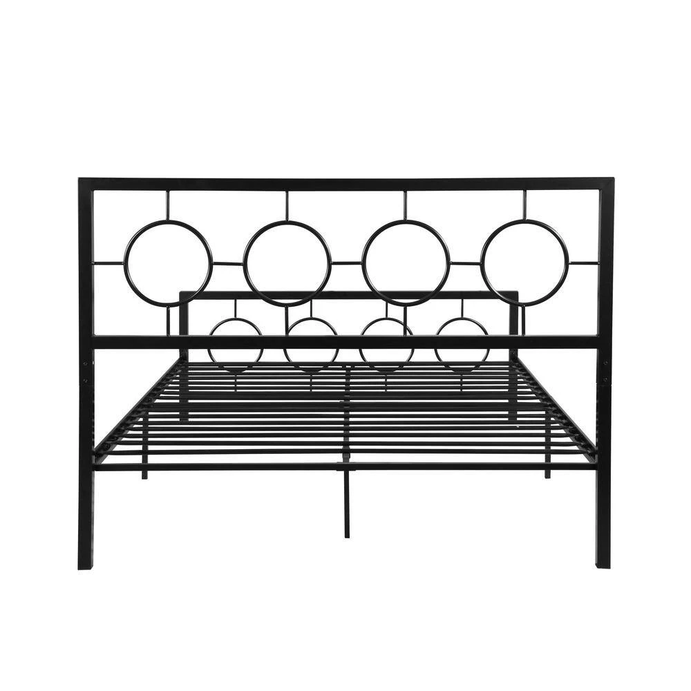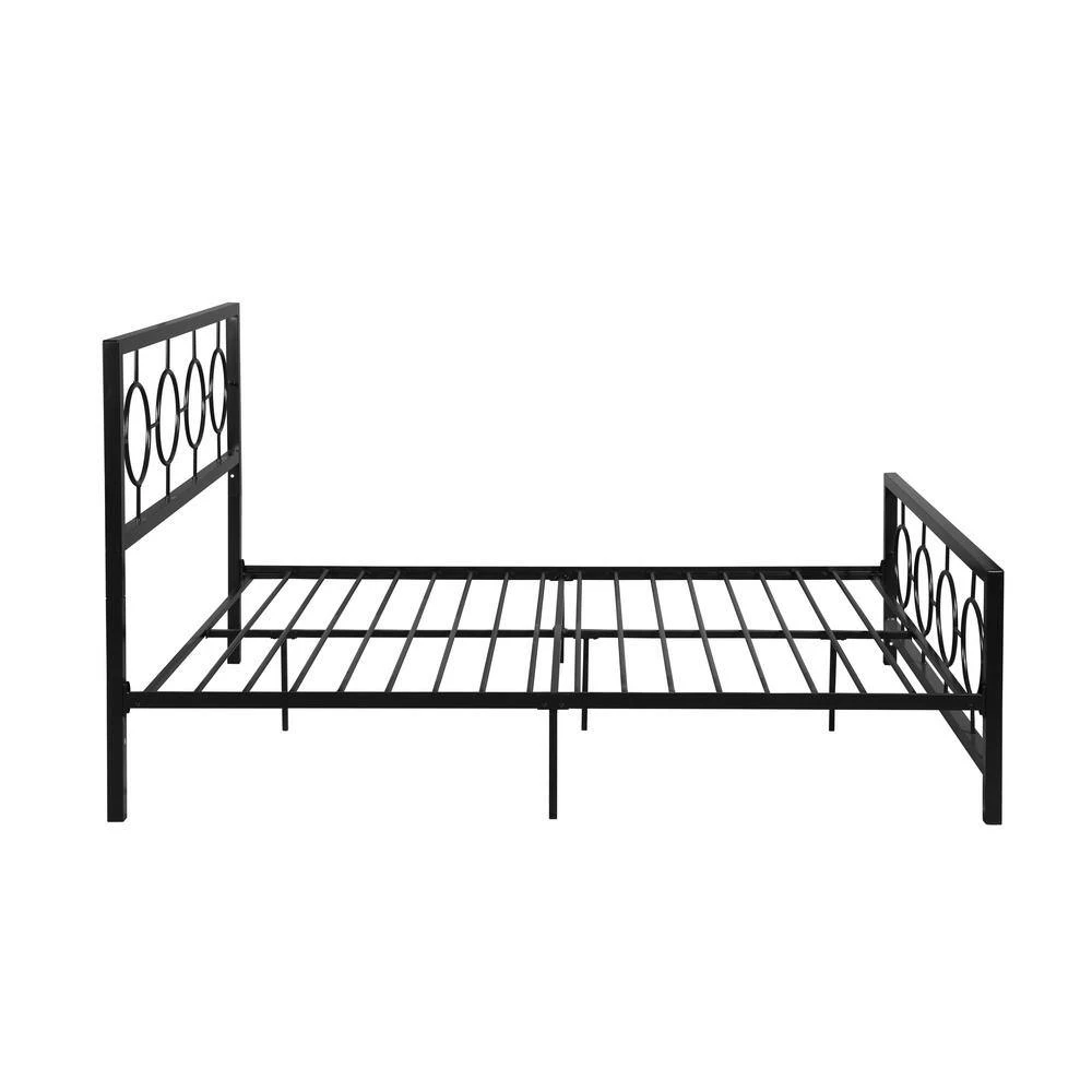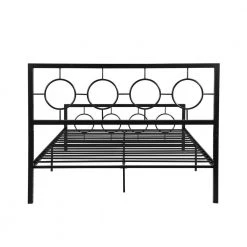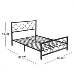 This full queen-size platform bedframe brings a touch of modern style to the bedroom. Its iron headboard and footboard are adorned with four suspended rings each. This minimal and versatile selection can be dressed to suit any scheme of decor.