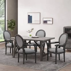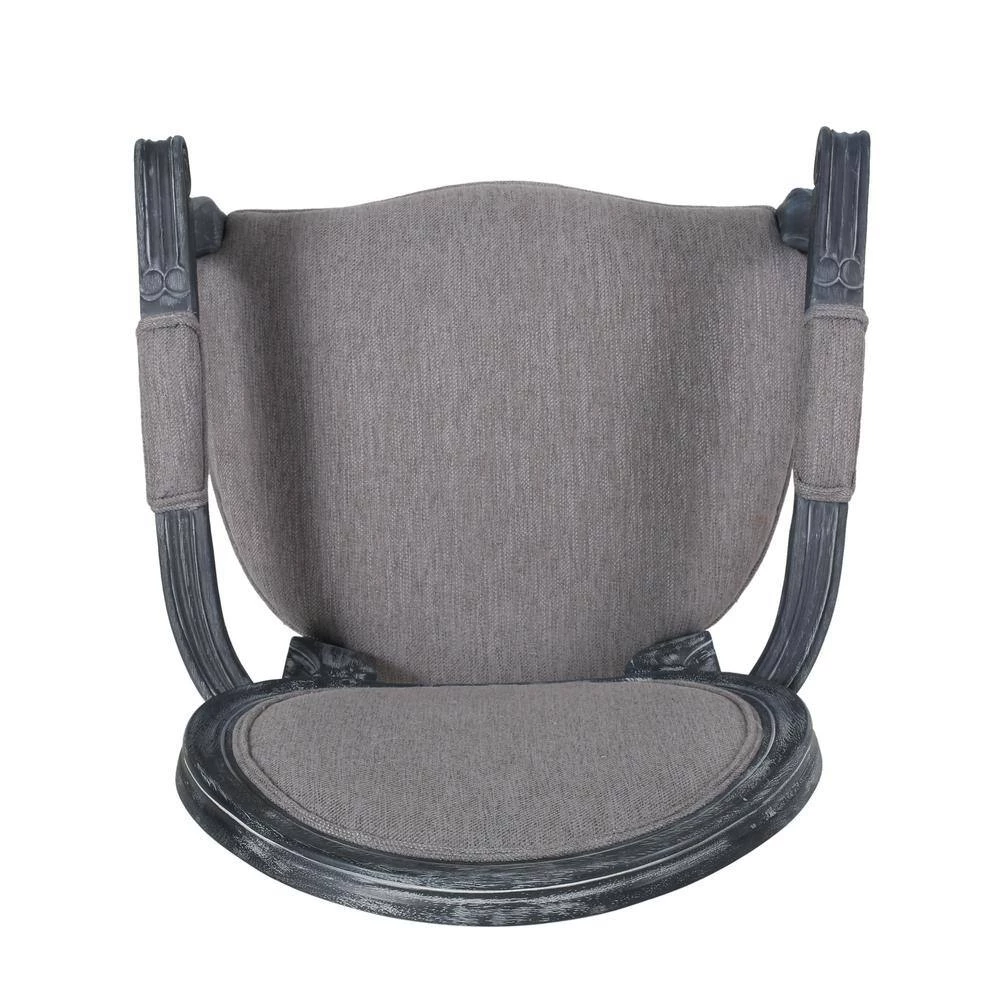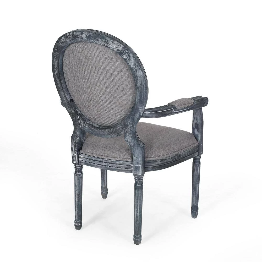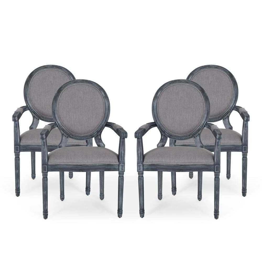 Bask in vintage opulence with seating that will turn your dining room into one of graceful appeal. Drawing from French country inspiration and Queen Anne styling, our set of upholstered dining chairs feature an iconic round backrest, fluted legs, and exquisite armrests to offer your home something a little out of the ordinary while also remaining true to their elegant, old-fashioned roots. Their weathered frames showcase wonderfully contrasting lines and curves that encourage both casual meals with your family or extravagant dinner parties with your guests.