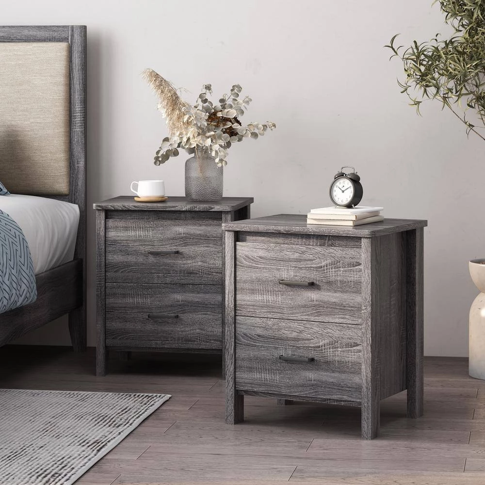 Spruce up your bedroom arrangement with a handsome accessory set that will easily keep your necessities at hand. Featuring a smooth wood-like finish and a minimalistic structure, our exceptional nightstand set brings contemporary sophistication to any bedroom with its sleek look. Each nightstand is completed with 2-drawers for plenty of storage space, giving you ample room and style to organize your items. Blending seamlessly with your existing decor, this streamlined nightstand set will frame your bed with a simple yet refined charm.