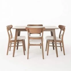 With matching wood finishes, you cant go wrong with this dining set. Including one table and four chairs, this set is ideal for any home. The mid-century style and smooth wood finishes of this set will complement any dcor, so you dont have to worry about clashing color pallets in your home. The dining chairs feature a sturdy design with soft fabric cushioned seats, providing both comfort and style for your dining pleasure.