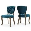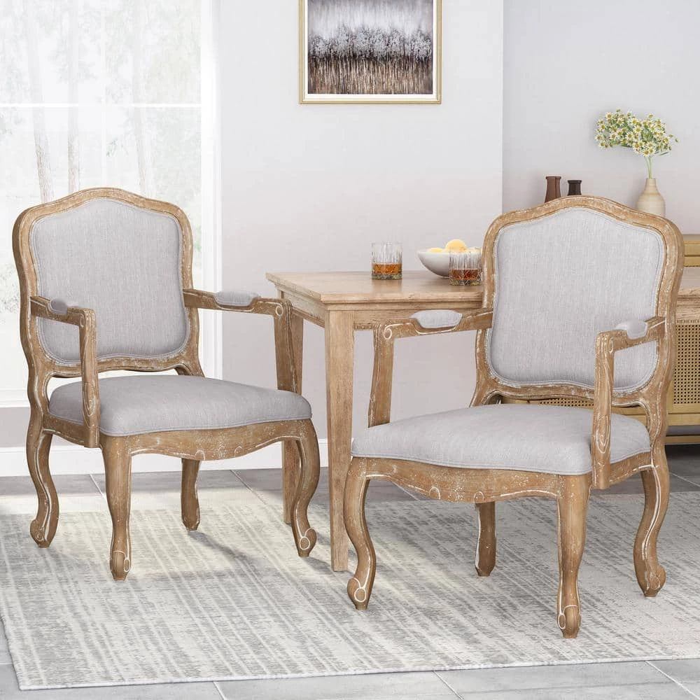 Transform your dining area into a stunning space that will accommodate any occasion. Drawing from French country inspiration for a rustic country atmosphere, our set of upholstered dining chairs feature an Old World styled backrest, graceful cabriole legs, and exquisite armrests to offer your home something a little out of the ordinary while also remaining true to their elegant, old-fashioned roots. Their weathered frames showcase wonderfully contrasting lines and curves that encourage both casual meals with your family or extravagant dinner parties with your guests.