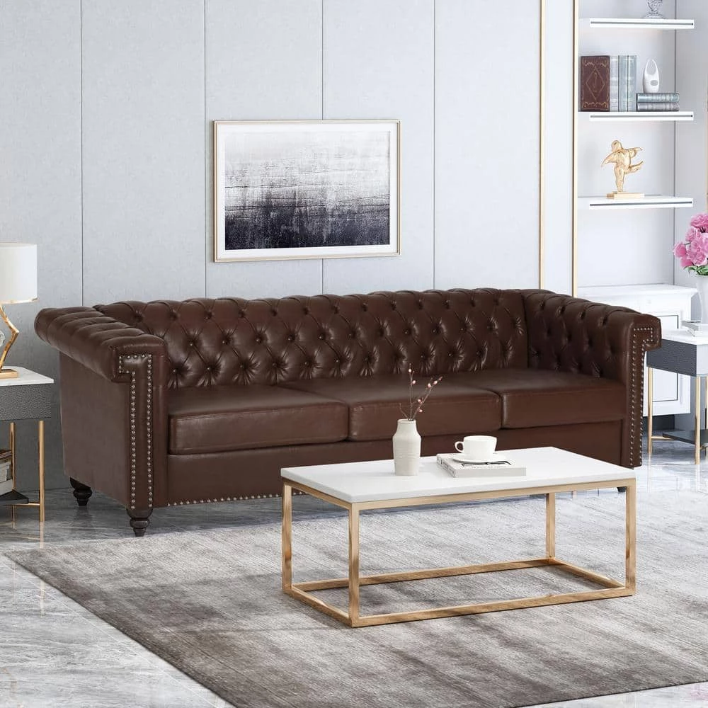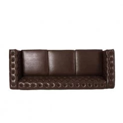 Bring home a timeless addition for your living room with our lasting Chesterfield style sofa. This lovely sofa is the ideal addition to any living room with its classic design and traditional elements such as deep button tufting, and nailhead accents. Featuring a low backrest and plush upholstery, this sofa stands as a streamlined statement piece that can change the whole flow of your living room, creating an open, clean space. Finished with beautifully turned legs, our sofa provides an elegant touch to any room.