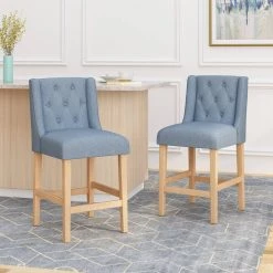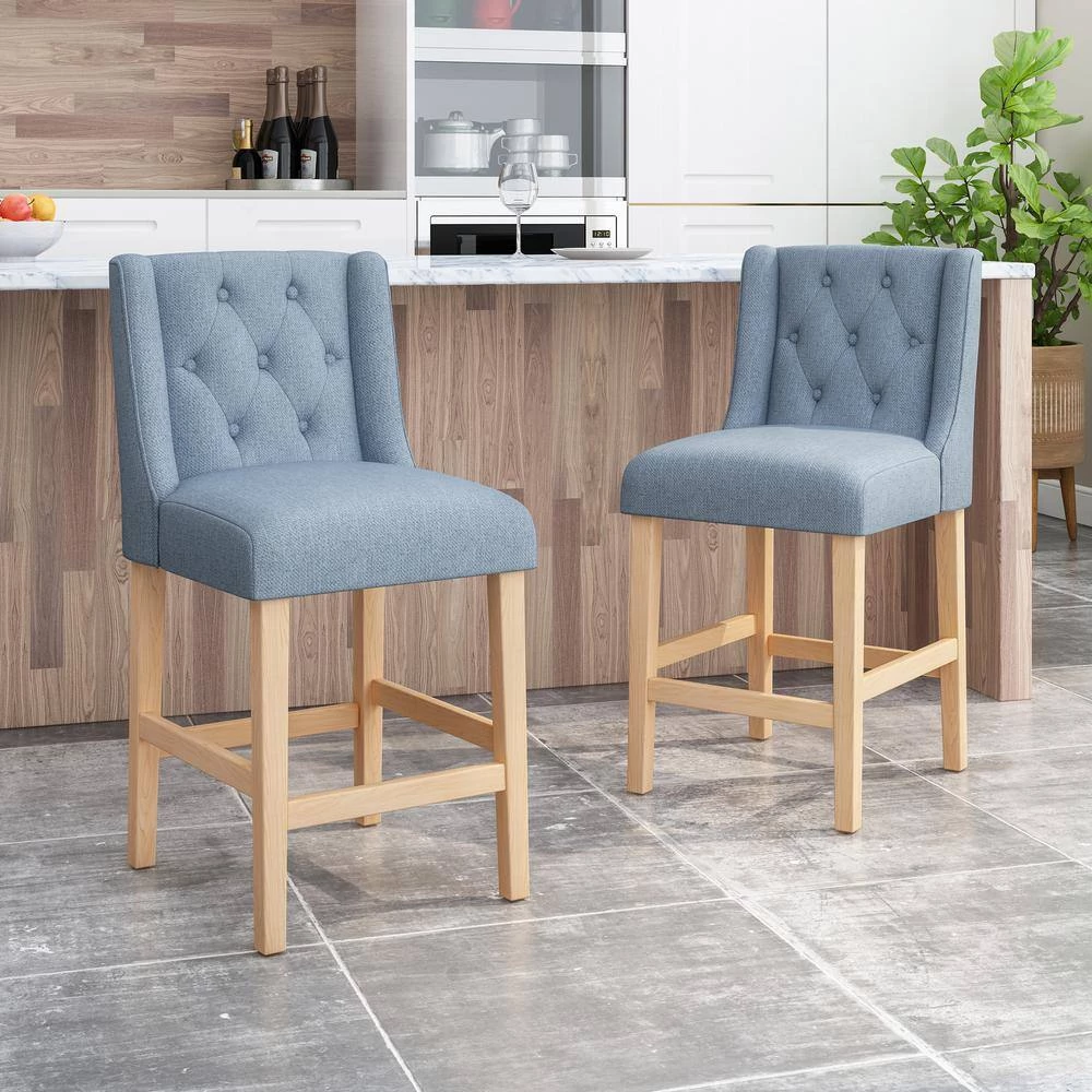 Pair a classic look with modern features to create a set of counter stools that bring any home a delightful touch. Featuring a traditional button-tufted backrest with diamond-patterned stitching and a modern wingback design, our counter stool set brings an elegant touch to any interior space. The upholstered seating offers your home effortless comfort and style that emphasizes the stools’ contemporary style. Finished with a solid rubberwood frame, this set of counter stools also provides sturdy durability to any kitchen counter or home bar.
