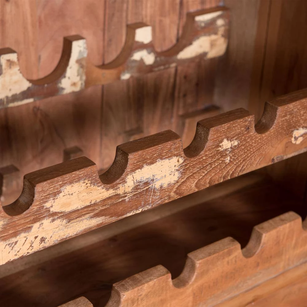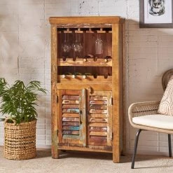 House your wine in a bar cabinet that is equally convenient as it is unique. Featuring recycled wood and artfully distressed paint, the color and finish of our bar cabinet will vary by the piece, making this accessory the perfect unique addition to your home. This cabinet brings a boho vibe to your space with its beautiful hand-crafted look that also serves as convenient storage to organize your wine and dine needs. With our delightful bar cabinet, your interior space will instantly transform with a touch of vintage charm and playful colors.