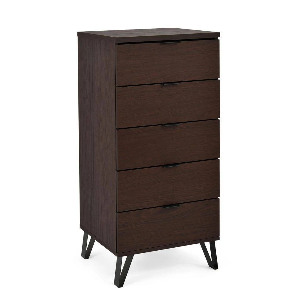 Storage space for your clothes is essential for an organized bedroom. Our stunning dresser easily brings a chic modern industrial atmosphere to any bedroom with a simple yet refined design, including flat hairpin legs and a rich wood-like finish. Made for both aesthetic style and convenient function, this outstanding accessory brings your home ample storage space with its five convenient drawers. Removing clutter is now an effortless chore with our impressive dresser, leaving you plenty of time to do more important things.