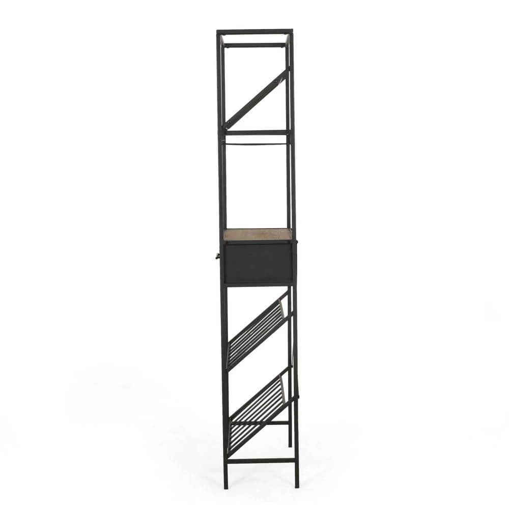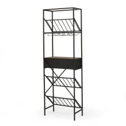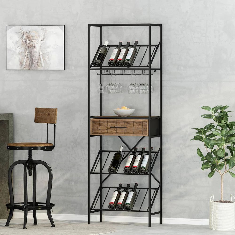 Display your collection of liqueur with an accessory that will keep you prepared for any wine tasting party. Our floor wine rack offers your home a sleek, sophisticated look that will hold your wine bottles and more with ease. Featuring space for twenty-one bottles, a wine glass rack with five slots, and one long drawer for extra storage, this minimalistic accessory is any wine lover’s dream. With a chic metal frame contrasted by a gorgeous wood look, this wine rack offers a stunning modern industrial look for your interior space.