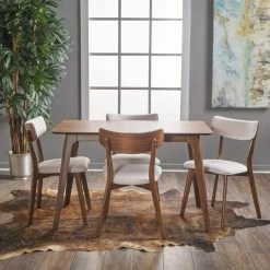 Add the perfect amount of modern to your dining room space. With matching wood finishes and contemporary styling, this set is a must have. The mid-century feel comes to life with both the chairs and the legs of the table. Featuring the ideal amount of modern touches, this set is sure to both please and satisfy in every way.