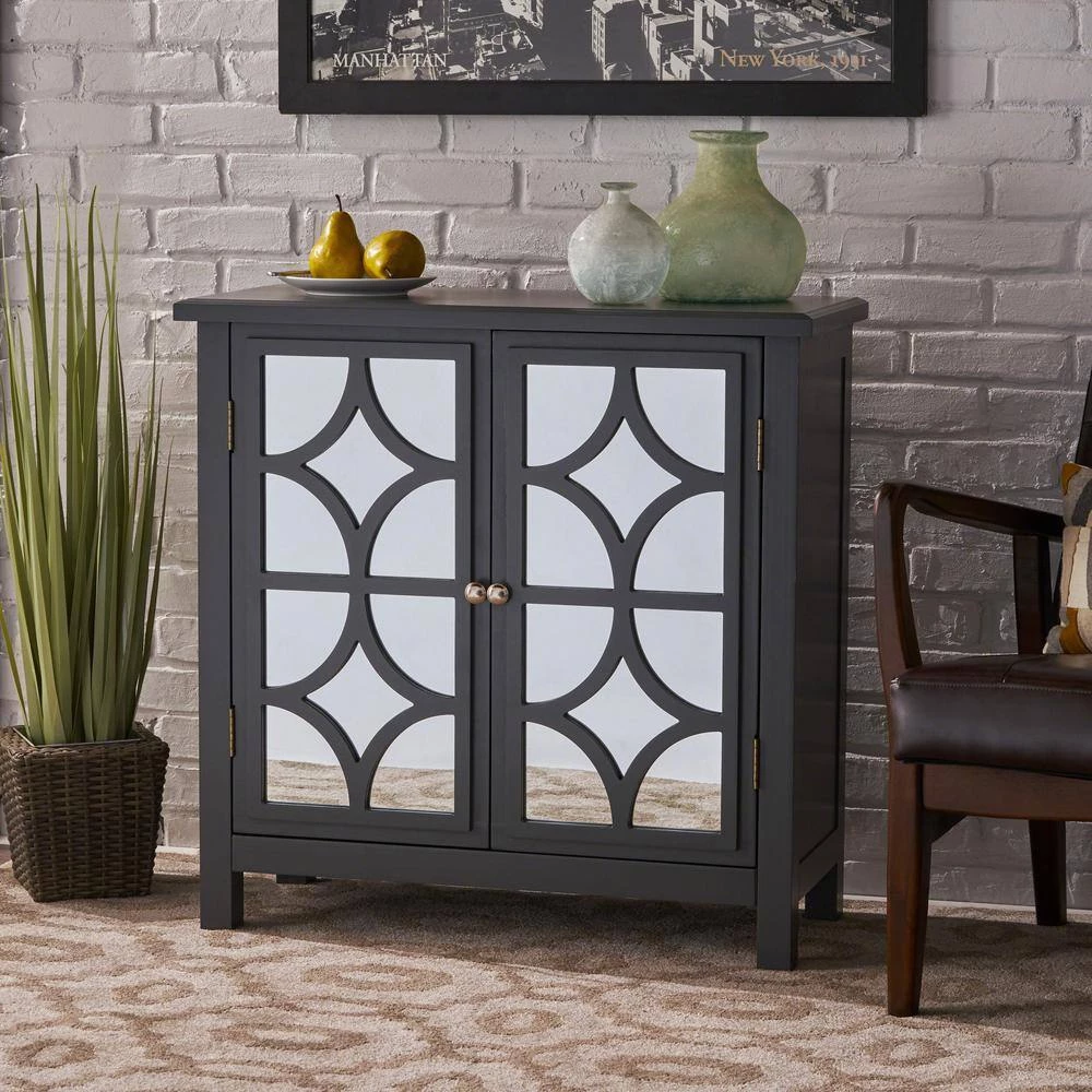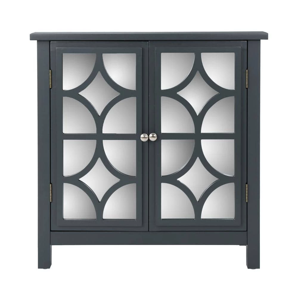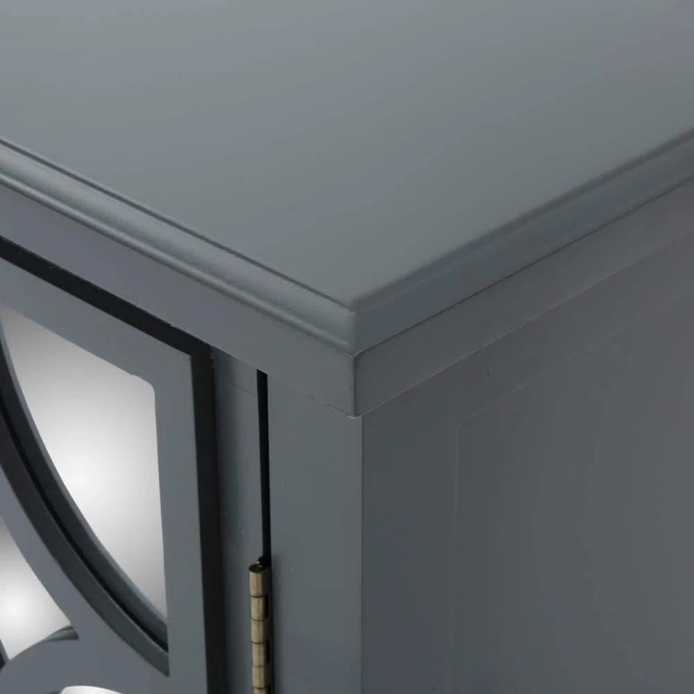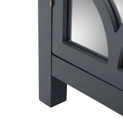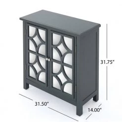This cabinet offers all the extra storage space you need in a unique and charming design that provides an open feel to any room with its reflective paneling. Featuring beautiful mirrored doors framed by a fir wood structure, this piece offers display space with beautifully constructed shelving that is sure to brighten any room. With a finely crafted curved diamond pattern on each door, this cabinet is created to the most exacting standards, making this an exquisite addition to any home.