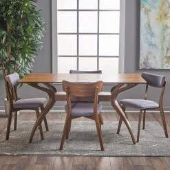 Add the perfect amount of modern to your dining room space. With matching wood finishes and contemporary styling, this set is a must have. The mid-century feel comes to life with both the chairs and the legs of the table. Featuring the ideal amount of modern touches, this set is sure to both please and satisfy in every way.