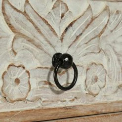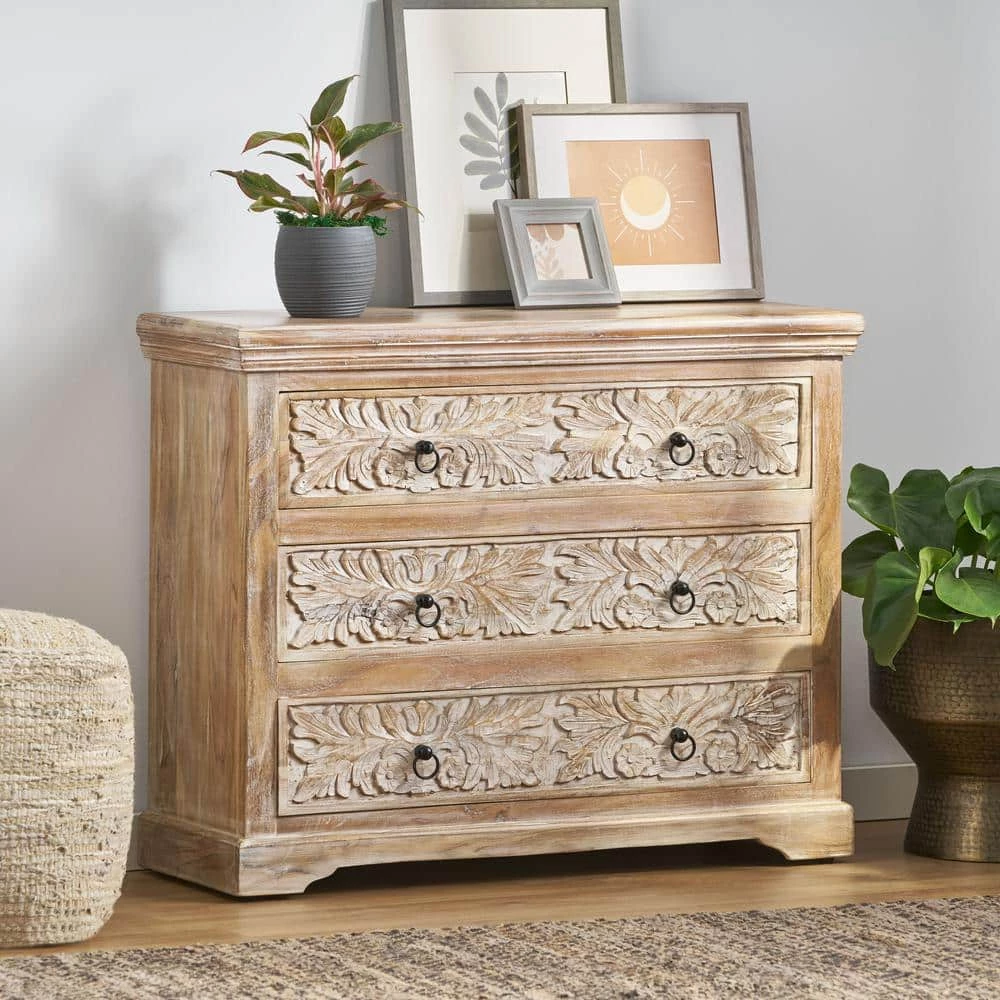 Is there too much clutter taking up all the space in your home. Say no more. Created for both functionality and impeccable style, our outstanding handcrafted acacia wood chest of drawers effortlessly brings a stunning bohemian atmosphere to any space with a carefree yet sophisticated structure and intricately carved floral accents. Completed with 3-drawers for ample storage space, our impressive accessory provides all sorts of options to remove clutter that will have all your guests in awe of your decor.