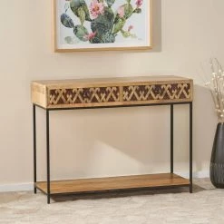 Our console table features a streamlined design and earthy colors along with metal knobs for easy drawer access, making this table a dream for any interior space. A perfect interior accessory for any home, this piece offers a rich wood color with a unique interlaced zigzag design for a sophisticated vibe. Whether you are using this in your living room or foyer, this elegant accessory allows you comfortable table space and a place to store your keys and other items whenever you need it.