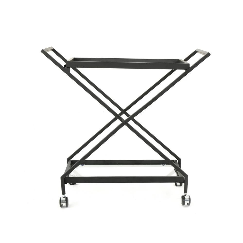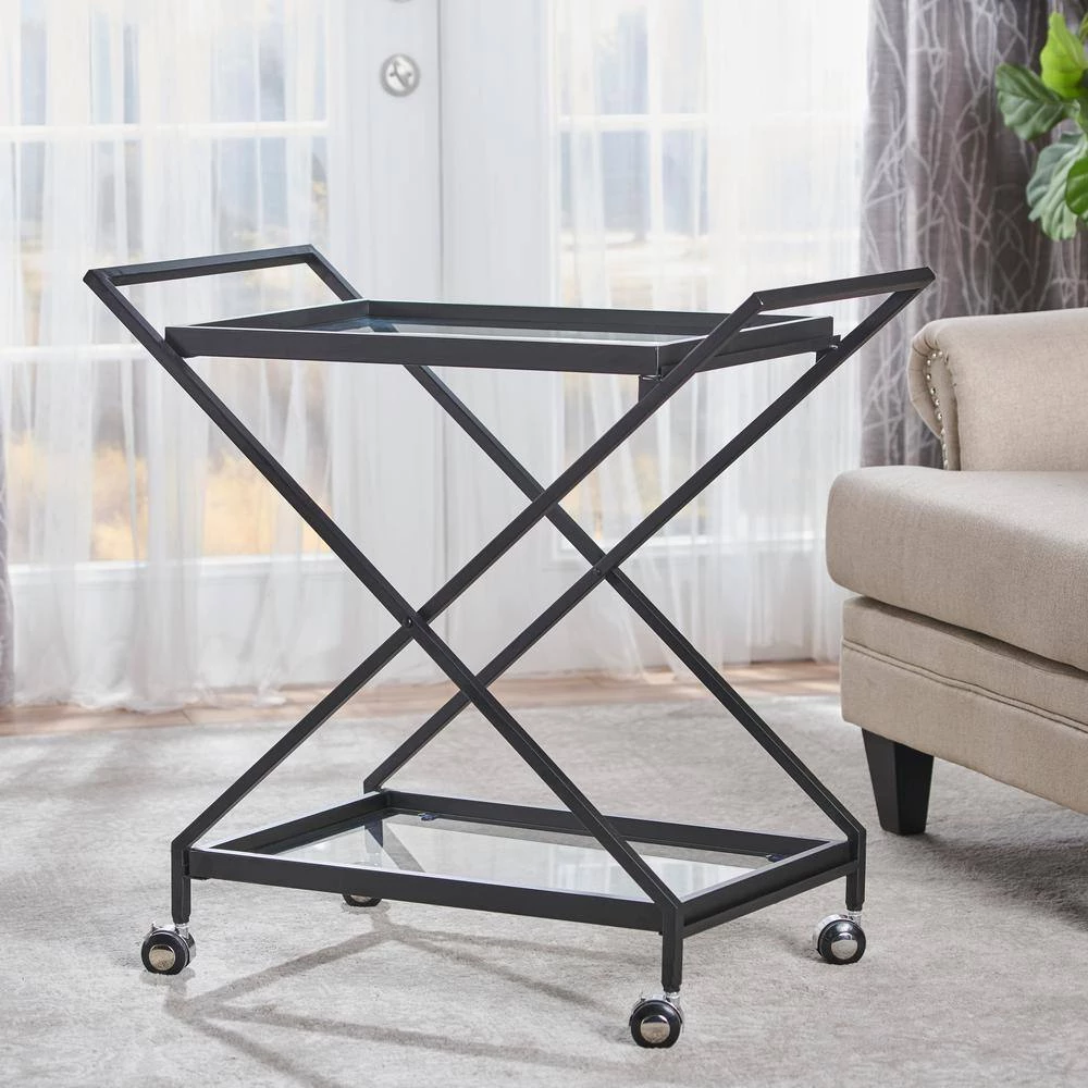 This industrial bar cart is a wonderful addition to any home. Featuring tempered glass shelves and swivel wheels, this bar cart can accommodate any type hosting needs you may have. The tempered glass shelves pair with the iron frame for a truly industrial look, while the swivel wheels allow you to go anywhere, any time. With minimal assembly, this cart will be a must have for all of your hosting needs in no time.