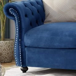 This timeless Chesterfield loveseat sofa finds new life in this update on a cherished classic. Featuring traditional rolled arms, intricately tufted and pleated upholstery, elegantly turned legs, and eye-catching nailhead accents, this deeply-seated selection will instantly become the centerpiece of your living room or other indoor seating area. Enjoy this lovely sofa for years to come.