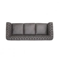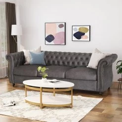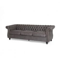This Chesterfield style sofa is the ideal addition to any living room with its classic design and traditional elements such as deep button tufting, scrolled arms, and nailhead accents. Featuring a low backrest, this sofa stands as a streamlined statement piece that can change the whole flow of your living room, creating an open, clean space. Our sofa also provides deep seating and exceedingly comfortable cushions specifically designed with your comfort in mind, ensuring that this will impress both you and your family.