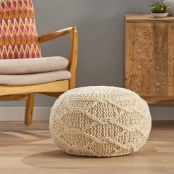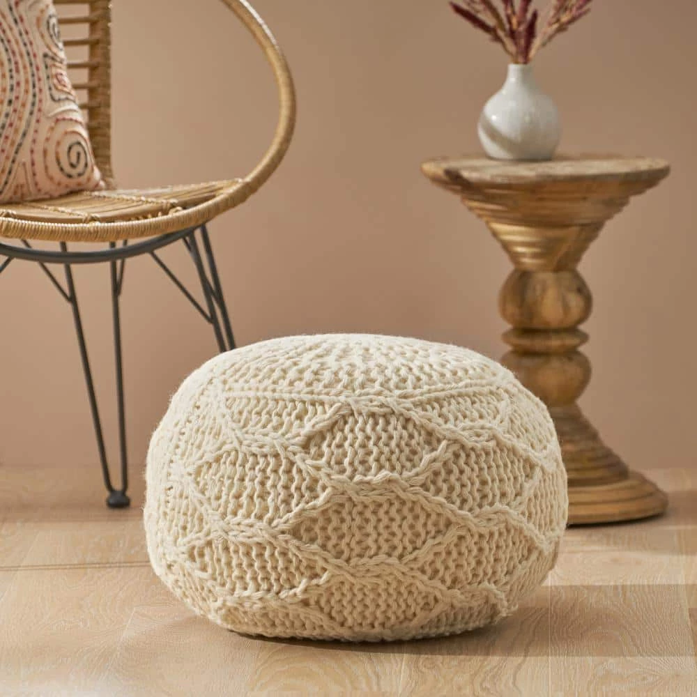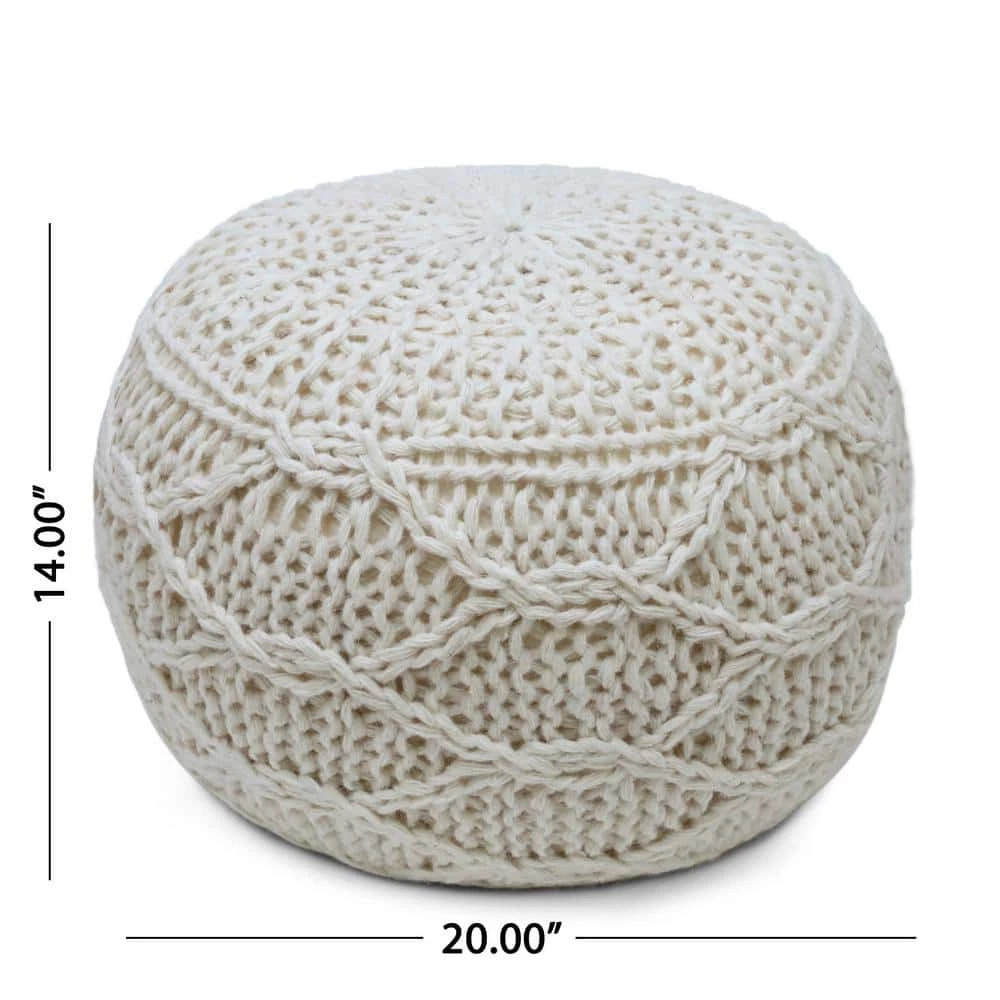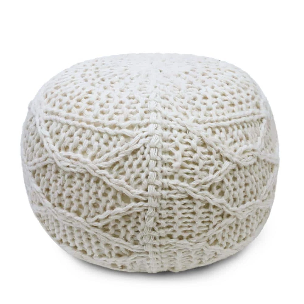 Presenting an articulate handwoven style, our charming accessory encourages lamp lit placements and window-side seating for cozy lounging. The compact pumpkin shape, knitted design, and webbed layers make this the perfect seating for children in a nursery or a colorful footrest in a stylish living room. Whether you’re looking to put your feet up after a long day or if you’re in need of extra plush seating, this pouf offers a variety of functions for you and your guests to discover.